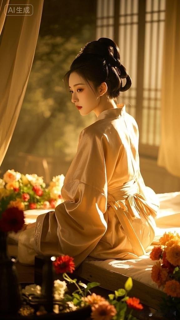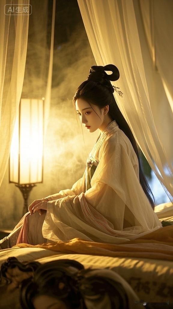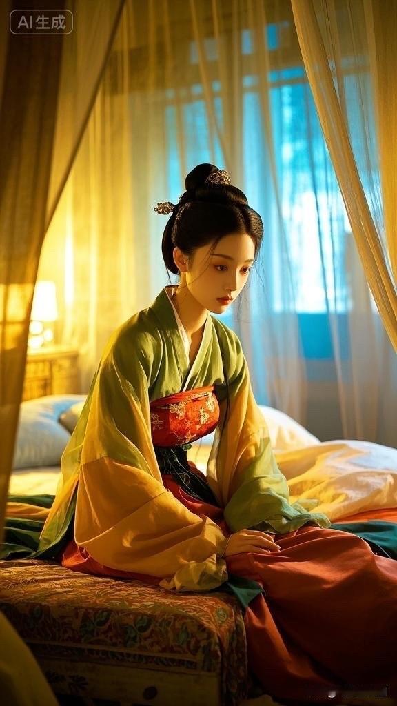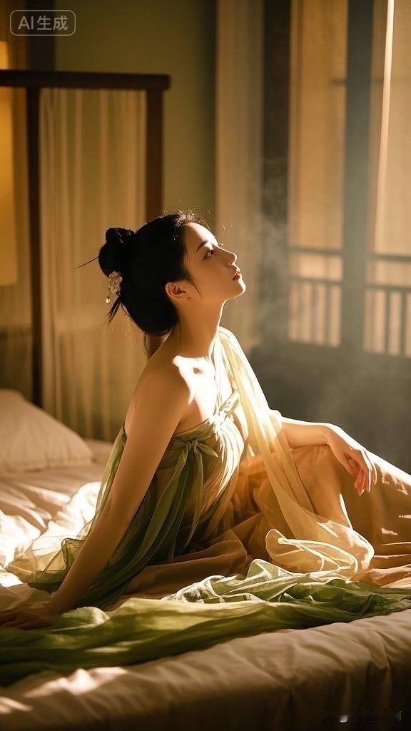 阳光洒进卧室,优雅女子沉思静坐