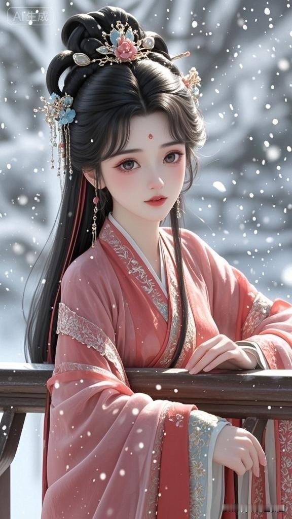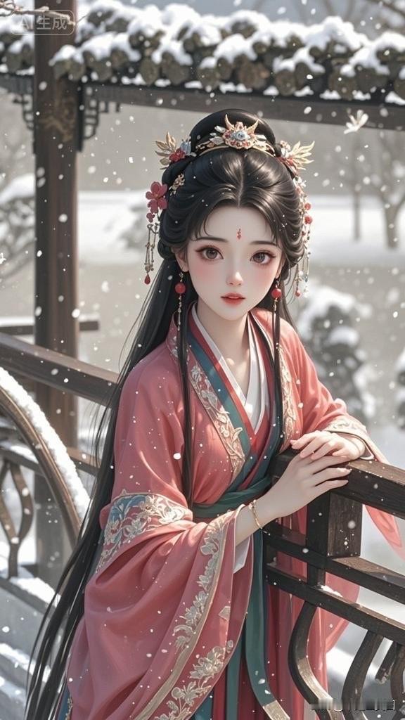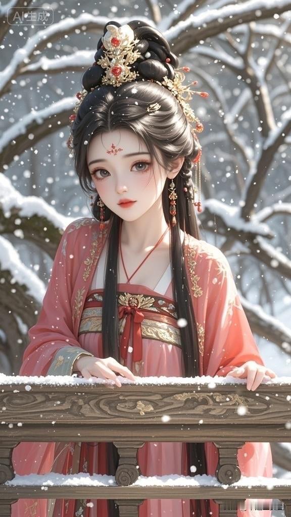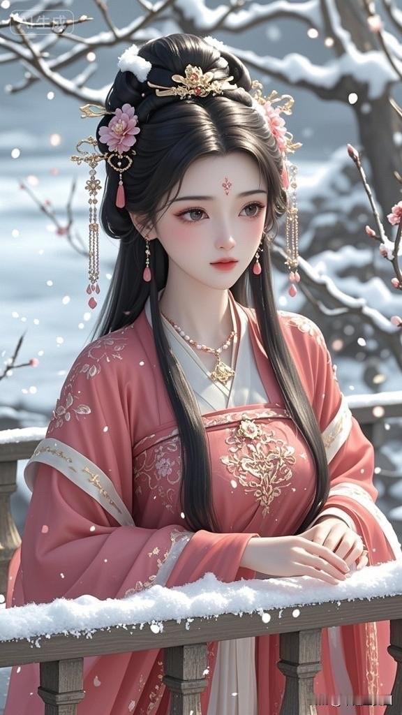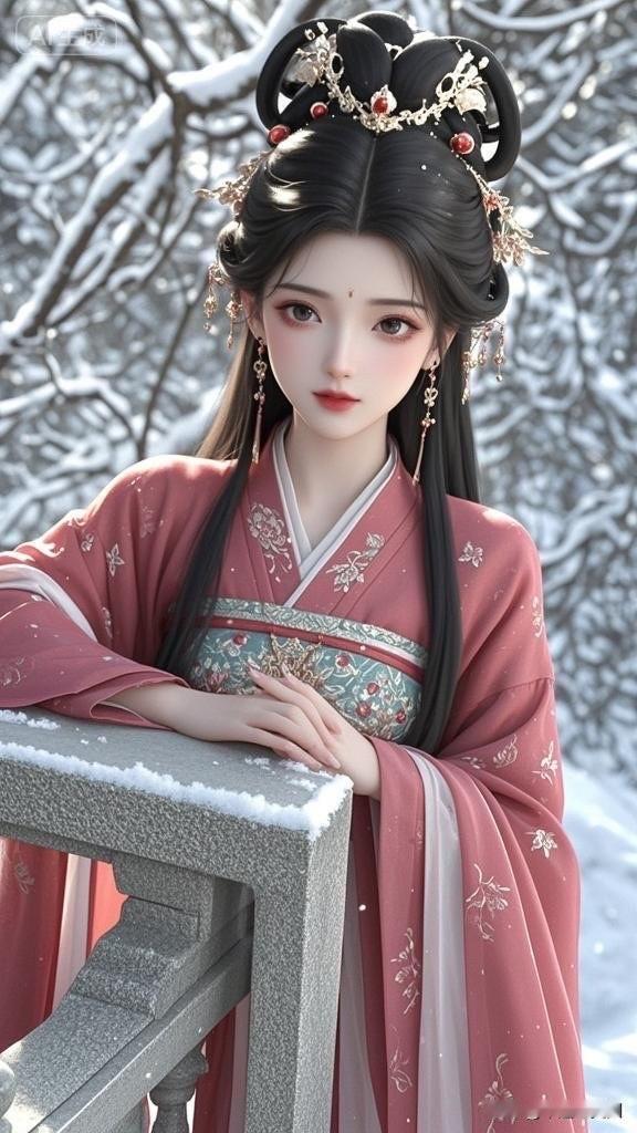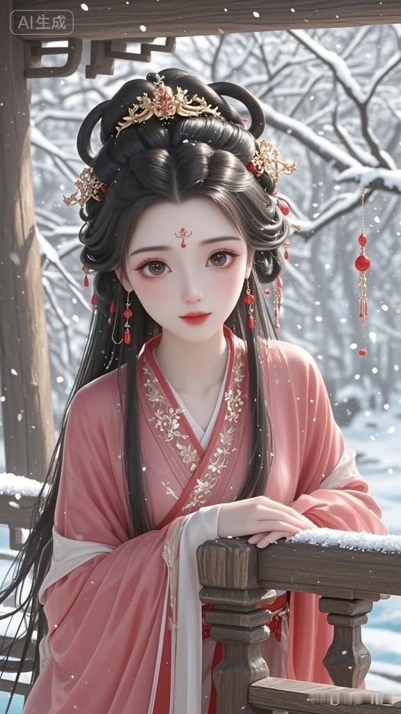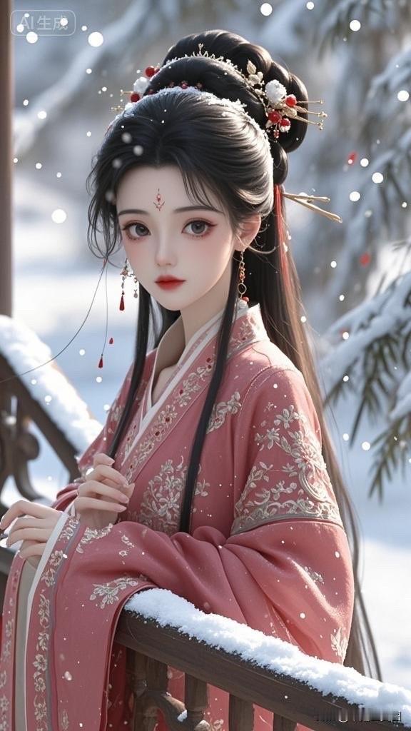 古风少女雪中仙姿,红衣飘逸,美若天仙。
