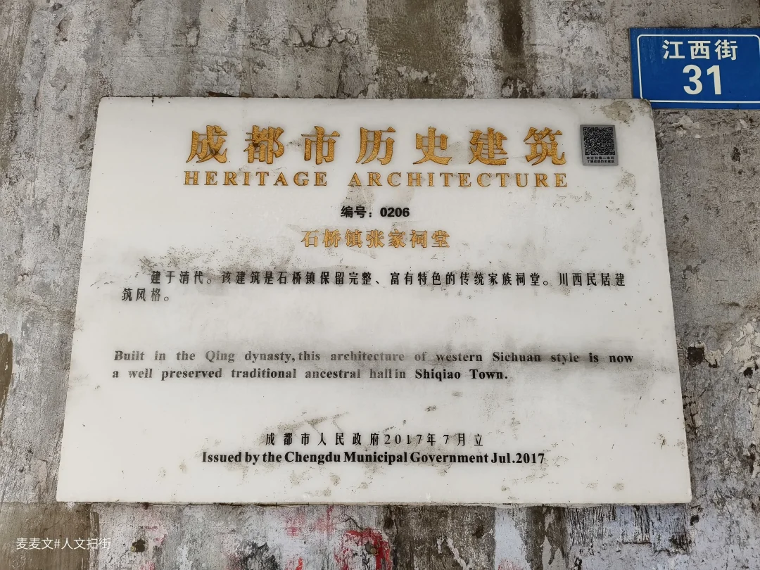 张家祠堂,是简阳石桥古镇标志性古建筑之一。四进四出的院落,沿天井成半对称结构,屋顶几经翻修,但保存较好。正门顶是歇山式,两边是砖头砌的镂空窗格,门楣上的对联在自然的风化下,已变得模糊不清。跨进前壁两步沿石梯上去四阶,才是木质的双合大门,高大的门槛两边各有一个小空间。进入祠堂,厢房如今已被出租,但依然能清楚地看见每间房屋都有不同花式的木格门窗,一些廊柱的额枋上,还有镂空雕花鎏金彩饰彰显着当时修建者的智慧和审美。