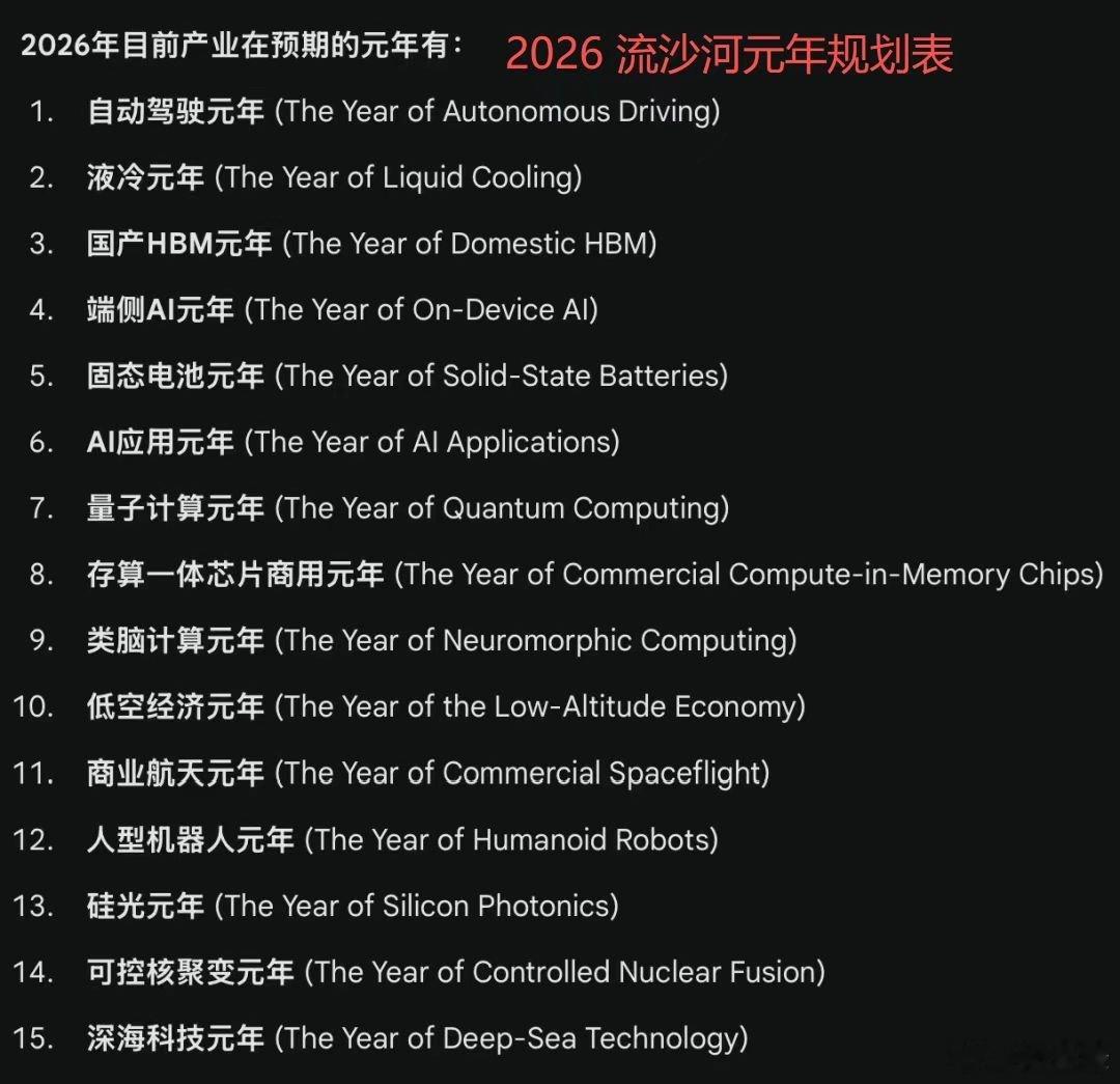 20261. 自动驾驶元年2. 液冷元年3. 国产HBM元年4. 端侧AI元年5. 固态电池元年6. AI应用元年7. 量子计算元年8. 存算一体芯片商用元年9. 类脑计算元年10. 低空经济元年11. 商业航天元年12. 人型机器人元年13. 硅光元年14. 可控核聚变元年