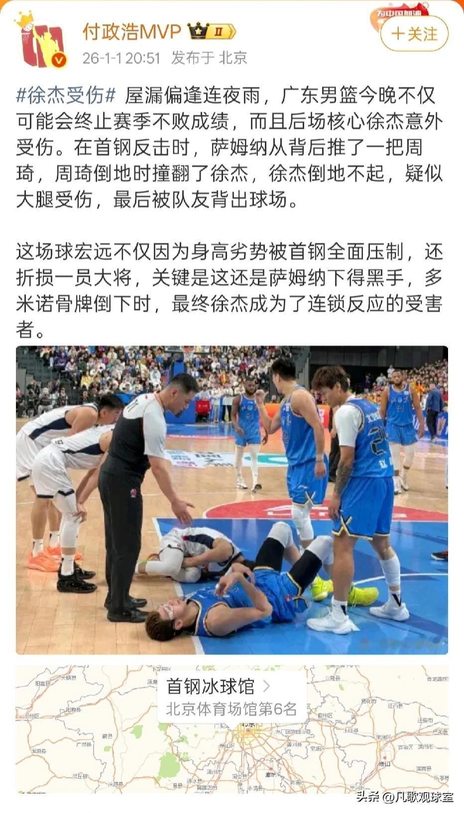 真敢说!媒体人付政浩:徐杰受伤真的不能怪周琦,是萨姆纳对周琦下黑手,隔山打牛,徐杰成了最终的受害者,当时北京反击,周琦快速跟进,萨姆纳从背后推了一下周琦,周琦倒地时顺势压倒了徐杰,导致徐杰的受伤! 可能广东球迷不太认同付政浩的说法,不过从录像回放来看,确实是萨姆纳从背后推了周琦一下,导致周琦失去平衡摔倒,最终误伤徐杰的!