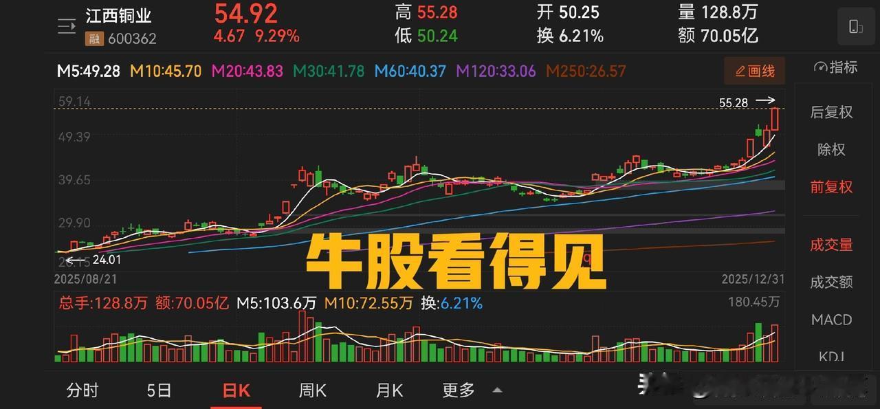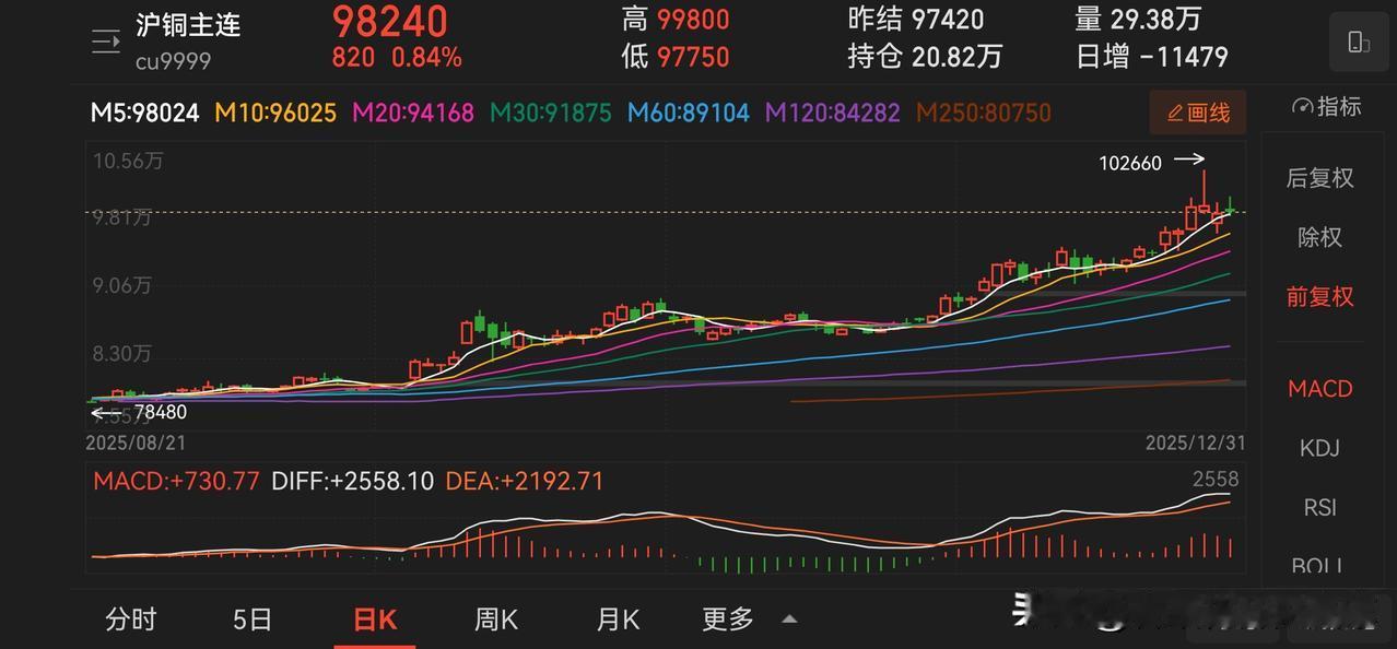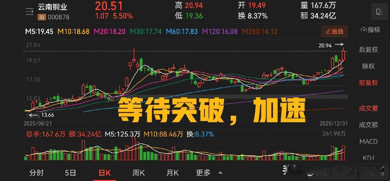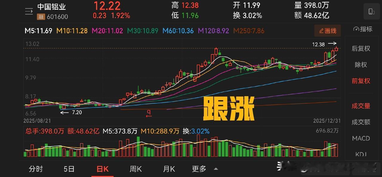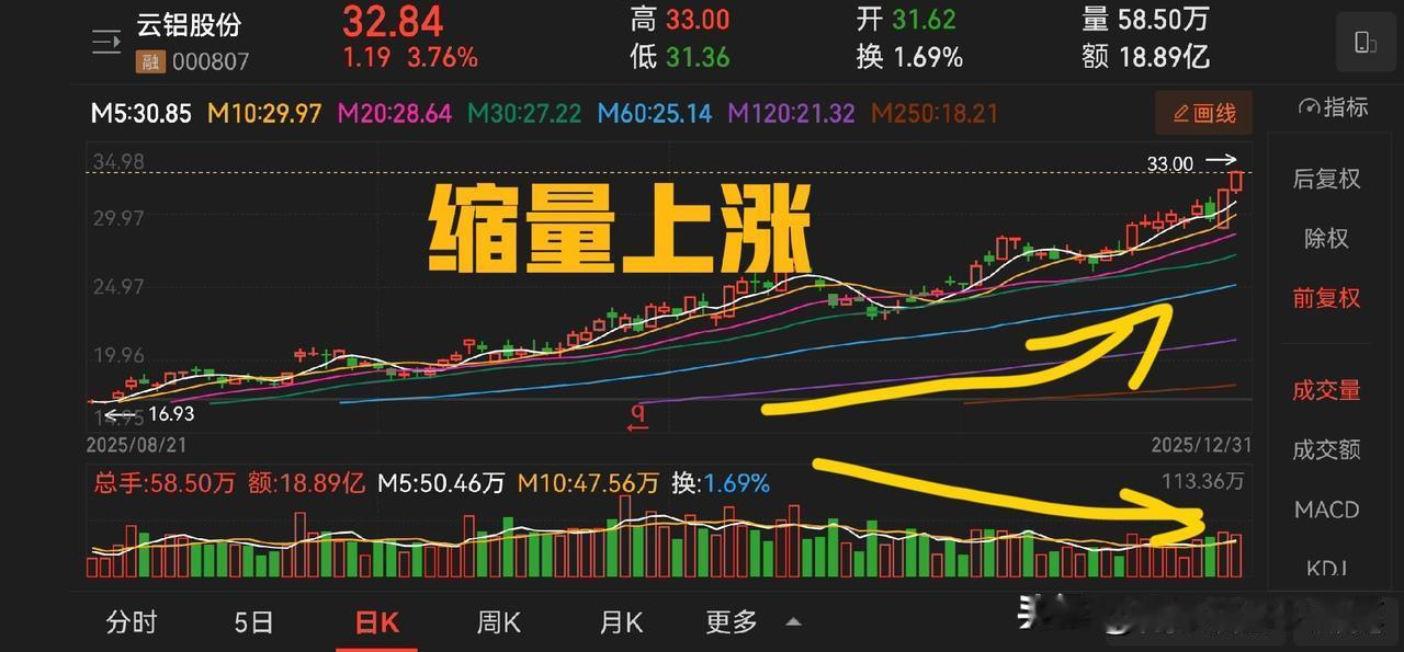 2025 年底最好的上涨故事莫过于铜,铜里面最好的故事莫过于江西铜业。铝代铜的故事里最好的是云铝股份,遥遥领先其他铝业股。 和江西铜业不同的是,云铝股份的量能已经有点缩小,这是已经在主升浪的一种表现。 云南铜业的故事留给了 2026 年。 中国铝业和神火股份滞后于云铝股份。 二十年的大周期,既已如此,那便如此。 新年伊始,万象更新,祝朋友们节日快乐,一起发财。