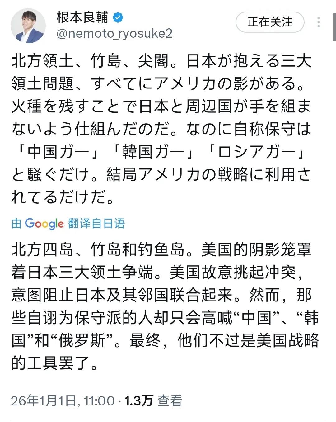 日本政治团体“翼之党”干事长根本良辅今天(1月1日)发文写道:“北方四岛、竹岛和钓鱼岛。美国的阴影笼罩着日本三大领土争端。 美国故意挑起冲突,意图阻止日本及其邻国联合起来。然而,那些自诩为保守派的人却只会高喊‘中国’‘韩国’和‘俄罗斯’。最终,他们不过是美国战略的工具罢了。” 根本良辅这段新年宣言,像一块石头砸进平静的水面,涟漪一圈圈荡开。他画了张特别的地图——北方四岛、竹岛、钓鱼岛,三个点连起来,上面盖着个巨大的影子,写着“美国”。这说法挺新鲜的,平常听多了“邻国威胁论”,突然有人说“问题不在东边在西边”,难免让人愣一下。 但仔细琢磨他说美国“故意挑起冲突”,听起来像是东京街头那些深夜居酒屋里,老派政治家抿着清酒发出的感慨。潜台词是什么? 日本像个提线木偶,线攥在别人手里。那些整天喊着“中国威胁”“俄罗斯侵略”的保守派,在他眼里不过是“工具”——这个词用得狠,直接把政治对手降格成了没有思想的器械。 咱们得看看这几个岛的故事。北方四岛,二战结束快八十年了,日俄还在拉锯;竹岛,韩国实际控制着,日本地图上却标着“固有领土”;钓鱼岛就更复杂了,绕着它的海浪里搅着历史、法律和民族情绪。 根本良辅把这些全归到“美国阴影”下,是不是太简单了?就像把一锅杂煮的所有味道都说是酱油的功劳,忽略了柴鱼、昆布、萝卜各自的味道。 他说美国要“阻止日本和邻国联合”,这话倒值得玩味。东亚这片地方,历史上恩怨纠葛像老树的根,盘根错节。即便没有外部力量,想要真心实意地握手,也没那么容易。 把责任全推给大洋彼岸,有点像孩子吵架怪家长没管好——家长也许有责任,但吵架的终究是孩子自己。 翼之党这个名字,听着就带着某种姿态。他们选择在新年第一天抛出这个观点,不是随口说说。日本社会正处在十字路口,老龄化、经济停滞、国际地位微妙,有些人想寻找新的解释框架,甚至新的敌人画像。根本良辅提供了另一种靶子:不是邻国,而是盟友。 这种论调能走多远?在如今的国际棋盘上,日本这颗棋子的移动空间其实有限。喊喊“摆脱美国阴影”容易,真要迈出步子,得掂量掂量手里的筹码。毕竟现实政治不是热血漫画,喊句口号就能变身。 各位读者你们怎么看?欢迎在评论区讨论。