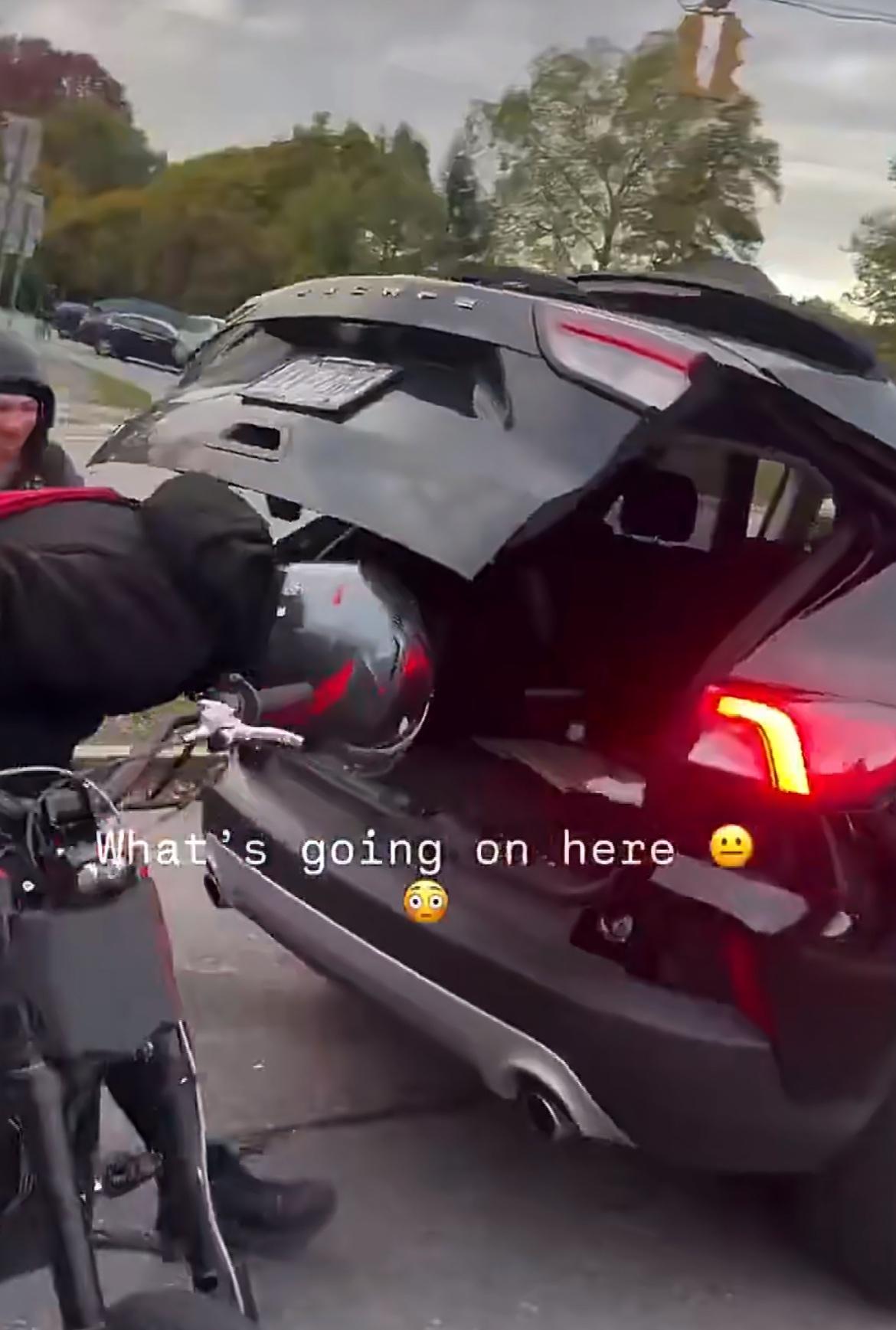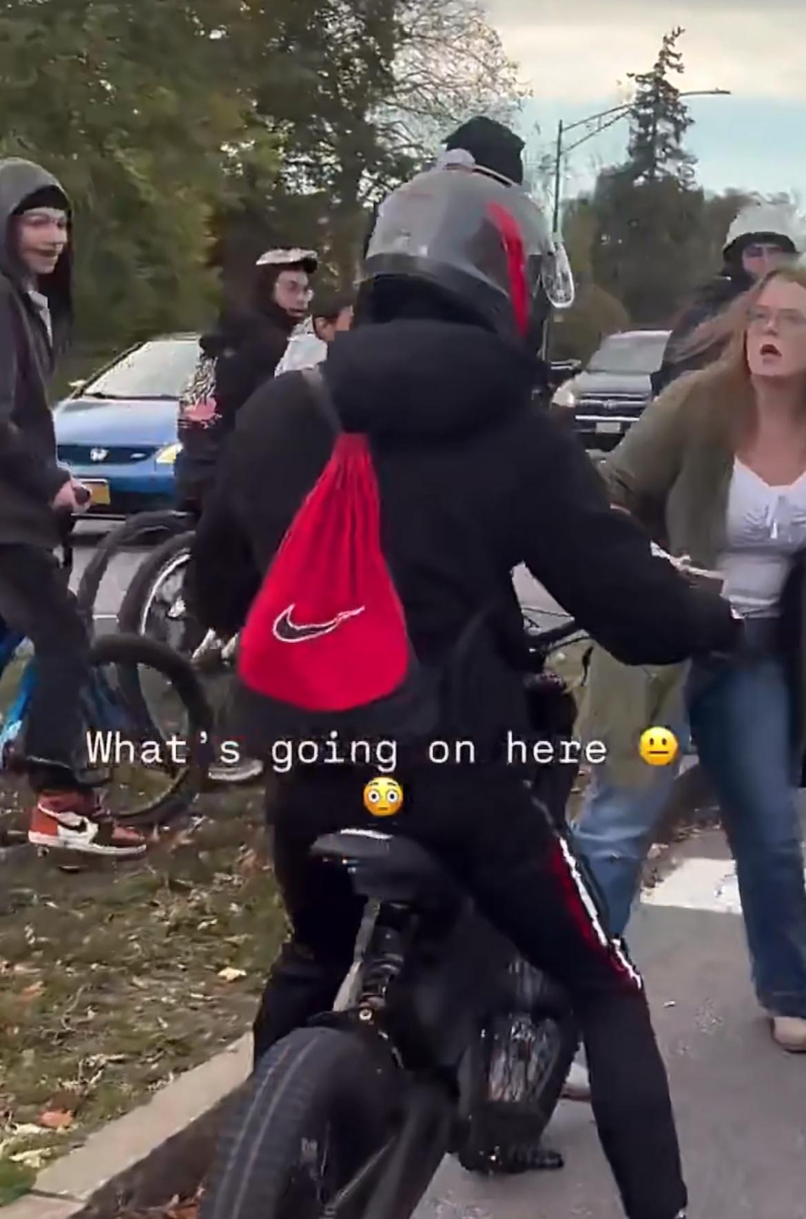 在美国等红绿灯的时候,一定要记得锁好后备箱和车门,一女车主在等红绿灯的时候,突然发现自己的车门被打开,一群骑着自行车的teenagers 在车后面拿东西,车主立马下车驱赶他们,没想到他们却很露出笑容嘲讽车主
