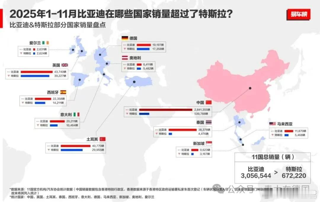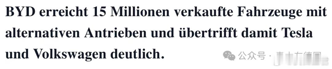 德媒:比亚迪突破1500万辆,远超特斯拉和大众!2025 年 12 月 18 日,中国汽车迎来历史性的一日:全球最大的新能源汽车制造商比亚迪第1,500 万辆新能源汽车在济南工厂正式下线。更有意思的是,这辆“里程碑车型”正是腾势 N8L,同时也是这款车的第 1.5 万辆下线。这一大突破也引发西方汽车行业的新震动!欧美媒体则喜欢把比亚迪这一数字与特斯拉与大众汽车进行对比,感叹“中国速度”!比亚迪庆祝突破1500辆比亚迪今年前 11 月累计销量达 418 万辆,较前一年同期增长 11.3%。其中海洋系列今年前 11 月累计销量达 203 万辆,增长 17.9%。今年 10 月份比亚迪第 1,400 万台新能源车在巴西工厂下线,巴西总统卢拉成了宋Pro 的车主。比亚迪第 1,500 万辆下线,用了整整 17 年,从 1,000 万到 1,500 万,只用了短短的 13 个月!这一数字涵盖纯电动汽车(BEV)和插电式混合动力汽车(PHEV)。比亚迪汽车产量再进化,不仅刷新中国新能源车的“加速度”, 也标志着这家中国汽车制造商在迈向汽车电动化的征程中迈出了重要一步。德语媒体关注比亚迪领先特斯拉和大众汽车“比亚迪正迈向全球引领新阶段!其新能源汽车的总产量,已经远远超过特斯拉和大众等众多国际主流汽车制造商。”德语媒体评论道:“曾经的电动车全球霸主——特斯拉,其电动车总销量也只有约810万辆。欧洲第一大汽车制造商大众汽车,历史上也仅销售了300万辆电动和插电式混合动力汽车。而在电动车生产上相对落后的丰田、福特等全球大型汽车制造商数据与比亚迪距离更大。”比亚迪成立于1995年,并于2003年正式进入汽车行业。此后,公司不断扩大产能,并提升电动汽车的产量。比亚迪此前已设定了到2024年底产量达到1000万辆的目标。甚至连比亚迪自身也未预料到,生产增长速度如此之快。比亚迪在许多国家超越特斯拉多款全球畅销车型为比亚迪全球销量突破1500万辆大关做出了重要贡献!Atto 3(中国市场名为“元Plus”,于2022年上市),在欧洲、亚洲、美洲、大洋洲等许多国家列电动车销售榜首。Dolphin Surf (中国市场名为“海鸥”,于2023年上市),也快速登上全球各国销量畅销榜。Dolphin(中国市场名为“海豚”)的销量也正式突破100万辆,跻身“全球电动汽车百万俱乐部”!腾势 N8L这些车型凸显了比亚迪在全球电动汽车市场日益增长的影响力。要知道,全球仅6款电动车跻身电动汽车百万俱乐部。其他车型,如Atto 2、Seal U、Seal 和 Sealion 7等在全球市场也卖得火爆,为比亚迪的不断创纪录提供了力量。除了扩大产能,比亚迪也高度重视技术整合战略,涵盖电池、电动动力系统以及智能驾驶辅助系统等各个方面。值得一提的是,比亚迪已于2022年正式停止生产纯内燃机汽车,成为少数几家全面转型为纯电动动力系统的大型汽车制造商之一。比亚迪2025年出海大获成功“第1500万辆新能源汽车的下线不仅代表着比亚迪内部的一个重要里程碑,也体现了比亚迪在全球电动汽车领域日益重要的地位。”德语媒体指出,未来几年,中国仍将在全球电动汽车产量中占据重要份额。而比亚迪的累计产量的不断突破,被认为是推动中国乃至全球汽车行业电动化进程,完成全球气候目标的关键因素!