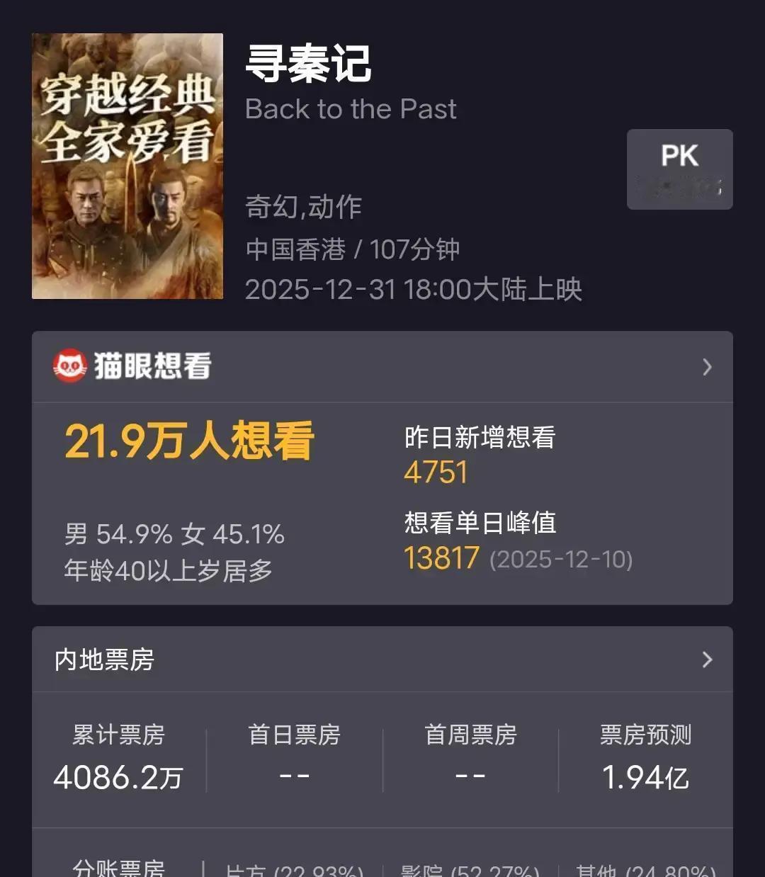 首日票房连前三都没挤进 古天乐把21年前的项少龙又扛回银幕,首日却只排到第四。影院里坐着的大多是三十好几的老观众,手机亮光稀稀拉拉,片头曲一响就有人抹眼泪。 故事还是那套:一群科学家集体掉回秦朝,激光枪对上青铜剑。项少龙的任务不是称霸,而是拼命按住历史不让它跑偏。双结局都圆,没谁死得难看,像给老粉递了张“别哭,一切都好”的纸巾。 我边上大哥看到嬴政出场直接抽噎,他媳妇拍他背说“当年你追这剧连熬三晚”。情怀杀确实狠,可剧情像被剪过的预告片,人物刚立住就切走。古天乐和林峯那场对手戏倒算惊喜,解释了穿越者为何改不了命——时间自己会缝洞,强行插手只会崩得更碎。 首周末1.2亿票房里,估计一半是还旧账的。猫眼8.7分,高得不像话,点进去看短评,十条有八条在晒2001年的剧照。电影好不好已经不重要,它更像一次集体扫墓,大家带着现在的肚腩和房贷,回去看一眼20岁的自己。 走出影院我翻了翻钱包,那张老剧DVD还在。突然明白,我们买的不是票,是时光机。