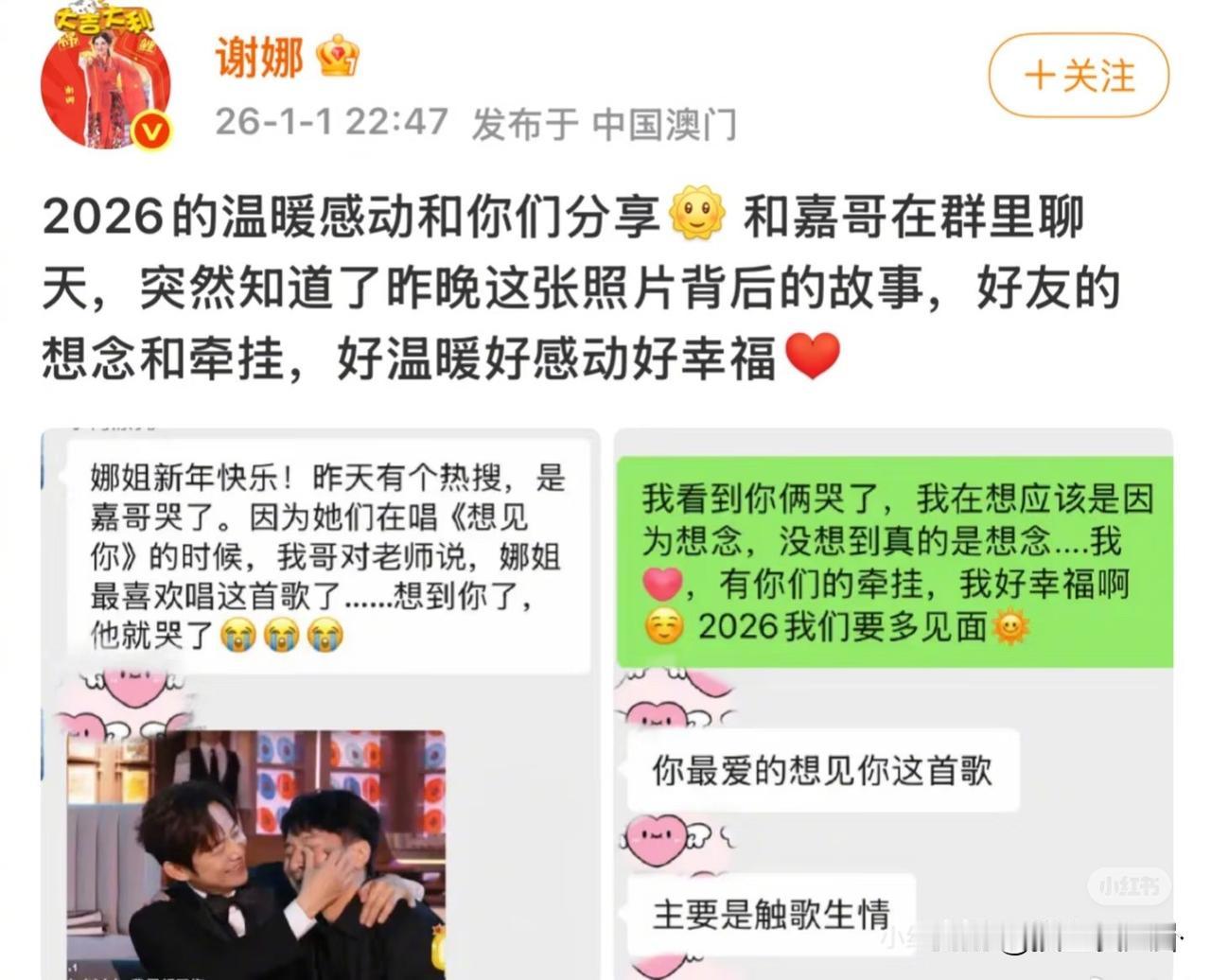 怎么会有谢娜这么幸福的人? 原来维嘉在跨年夜哭 是因为触歌生情想谢娜了! 零点的时候爱人在身边,好朋友们也在想念自己。 天啊!!想想就好幸福