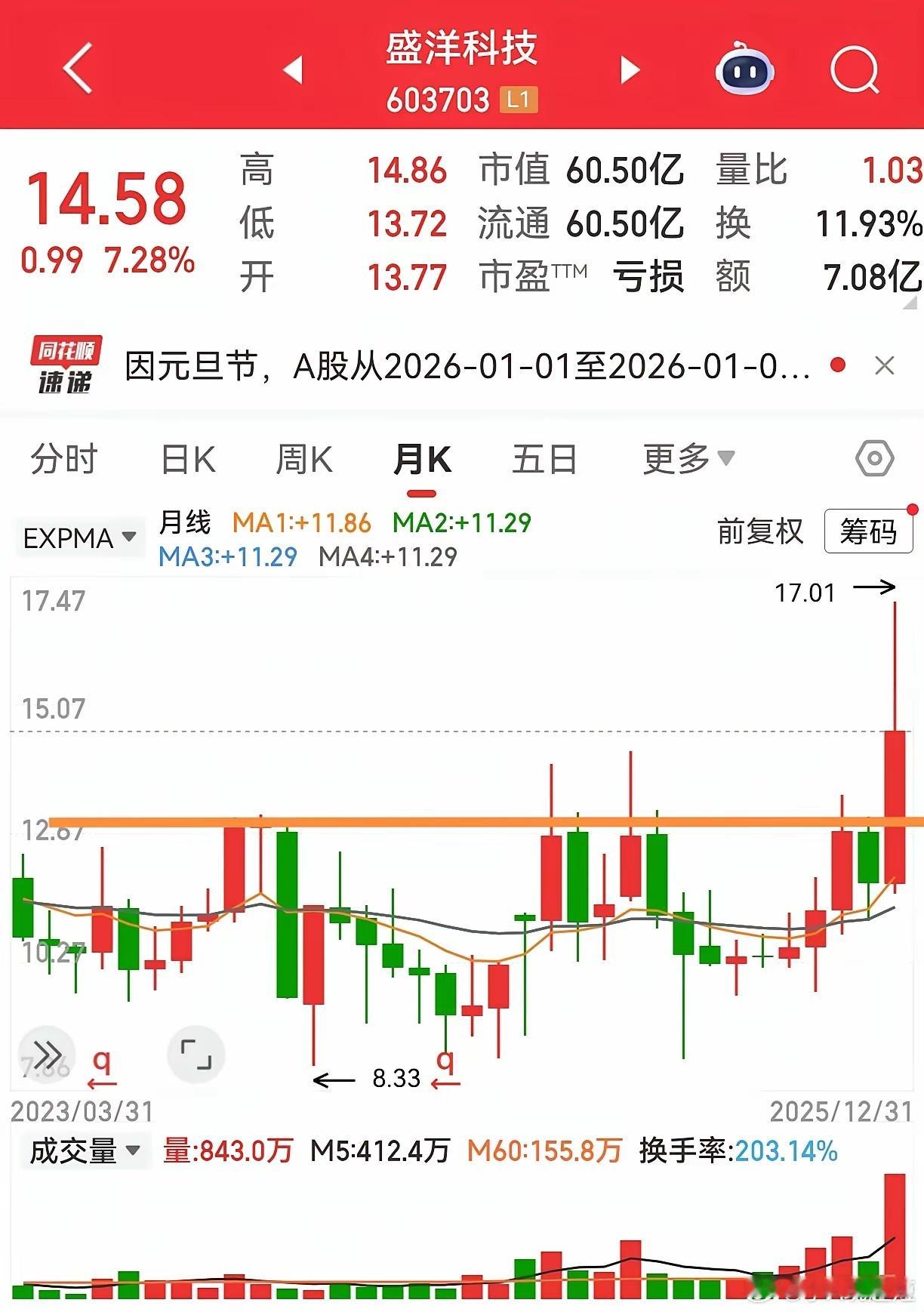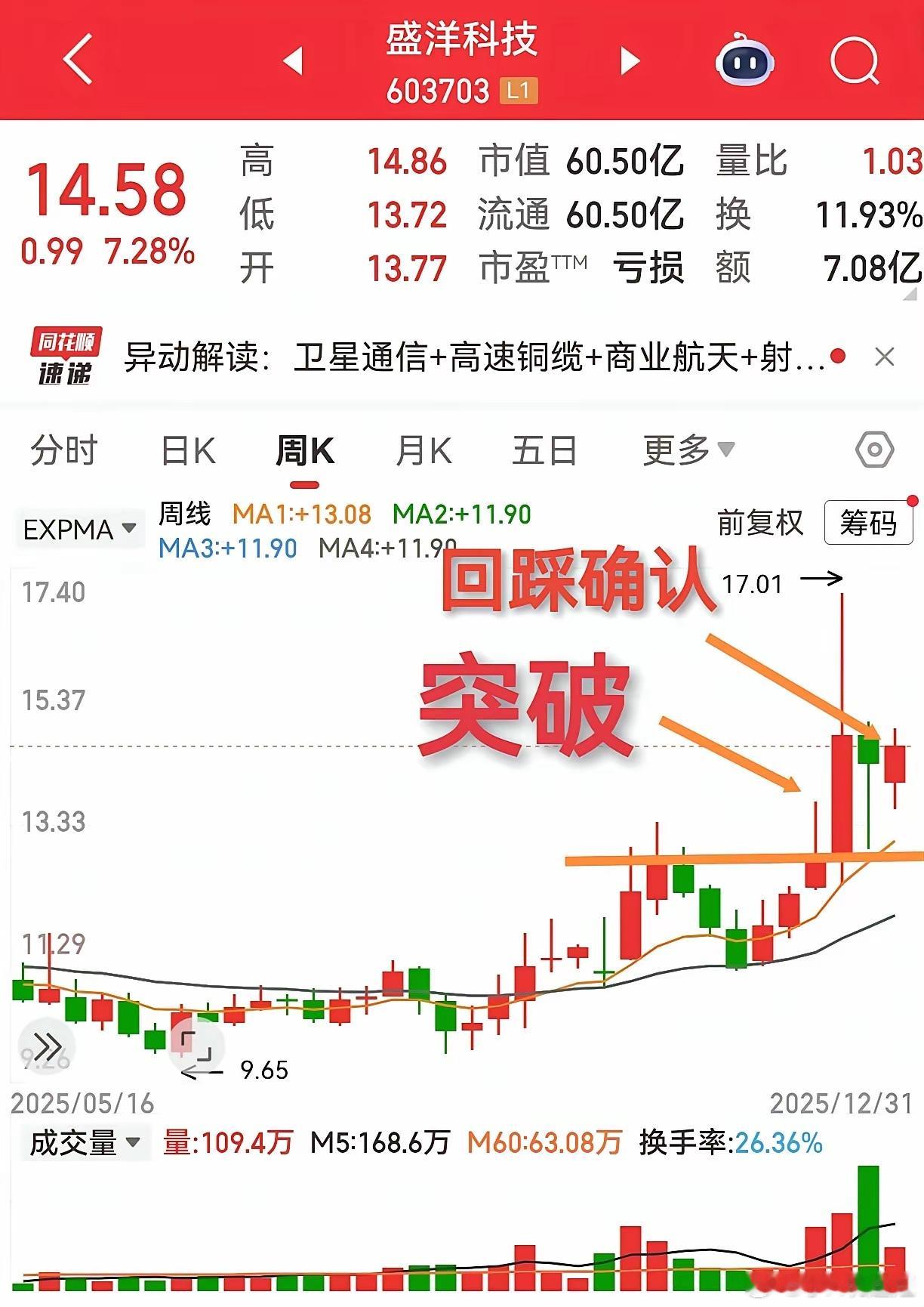 放假期间,静下心来,选选看看,哪些品种值得节后观察。大多数人是不想追高的,实际上高位要看有没有什么样的实质性信息,如果有实质性的发展性的确定性的信息,有一些初级阶段的走势并不高,也只有这些品种才会走出大趋势。即使如此,但我们还是不愿意选择高位的,那怎么办呢?简单,就是找没怎么大涨的,又有异动的来观察观察。盛洋科技,基本面信息,卫星导航,商业航天,较相关。这个是贯穿25—26年的主线。看看K线形态,日线,前面两个一字板是无量的,无量就是大家都没卖,想买的也买不到,然后大阴线下跌,29%的换手率,这种换手率,属于较大换手,有人出货,但没有继续上涨,说明承接不强,主力不愿意继续拉升,有两种可能:一是主力手上货不多,拉升是帮别人抬轿,下跌洗盘再吸货。二是主力无心念战借利好出货,将手上筹码一股脑地抛给散户。如果是第一种情况,洗盘再吸货,后期就不会下跌太深,以不跌破主力成本区域为好。如果是第二种情况,出货则一路阴跌没有支撑。好了,再来看看日线形态,连续回调三天后止跌企稳,此处也正好是前面二连板的起涨处,没有再继续下跌。然后再来一个放量阳线,有回调下跌,缩量,最后一天没有继续下跌,说明主力成本也许就在附近,继续下跌就跌穿成本了,而是放量反包,放量阳线,重新站上生命线。我的分析,不希望被主力看到,所以没有耸人听闻的标题,没有豪华美丽的辞藻,也没有判断后期的结论,各位自行解读。股票潜力分析