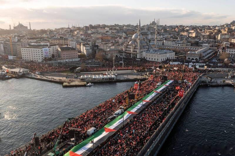 【土耳其民众声援巴勒斯坦!伊斯坦堡元旦大游行吸引50万人上街】海外新鲜事 在新年伊始,数十万土耳其民众走上伊斯坦堡街头,参加声援加沙的元旦集会游行。示威群众挥舞巴勒斯坦旗与土耳其国旗,高喊口号,呼吁终止这片饱受战火摧残土地上的暴力冲突。外媒记者现场目击,大批群众在晴朗低温的天气下步行至伊斯坦堡加拉塔大桥,参与以“沉默非金,勿忘巴勒斯坦”为口号的集会。游行期间,不仅有人发表演讲,黎巴嫩出生的穆斯林歌手Maher Zain还献唱《解放巴勒斯坦》(Free Palestine),为活动助阵。据警方消息人士及土耳其国家通讯社安纳杜鲁新闻社(Anadolu Agency)报道,约有50万人参加此次挺巴集会游行。此次活动由超过400个民间社运组织联合参与,其中包括由土耳其总统埃尔多安(Recep Tayyip Erdoğan)幼子比拉尔·埃尔多安(Bilal Erdoğan)担任董事长的教育慈善机构“伊利姆亚伊玛基金会”(Ilim Yayma Foundation)。比拉尔表示,希望新一年善意与美好降临土耳其全境,以及受压迫的巴勒斯坦人民。土耳其长期以来是加沙冲突的直言批评者之一,并曾协助促成以色列与巴勒斯坦武装组织哈马斯于去年10月10日达成停火协议。但自协议生效以来,仍有超过400名巴勒斯坦人在冲突中丧生。图1:2名示威者1日在估计有多达50万人参与的土耳其伊斯坦堡元旦挺巴大游行上挥舞巴勒斯坦旗帜。 (美联社)图2:土耳其大城伊斯坦堡1日举行挺巴勒斯坦大游行,示威群众几乎占满加拉塔大桥。 (路透)