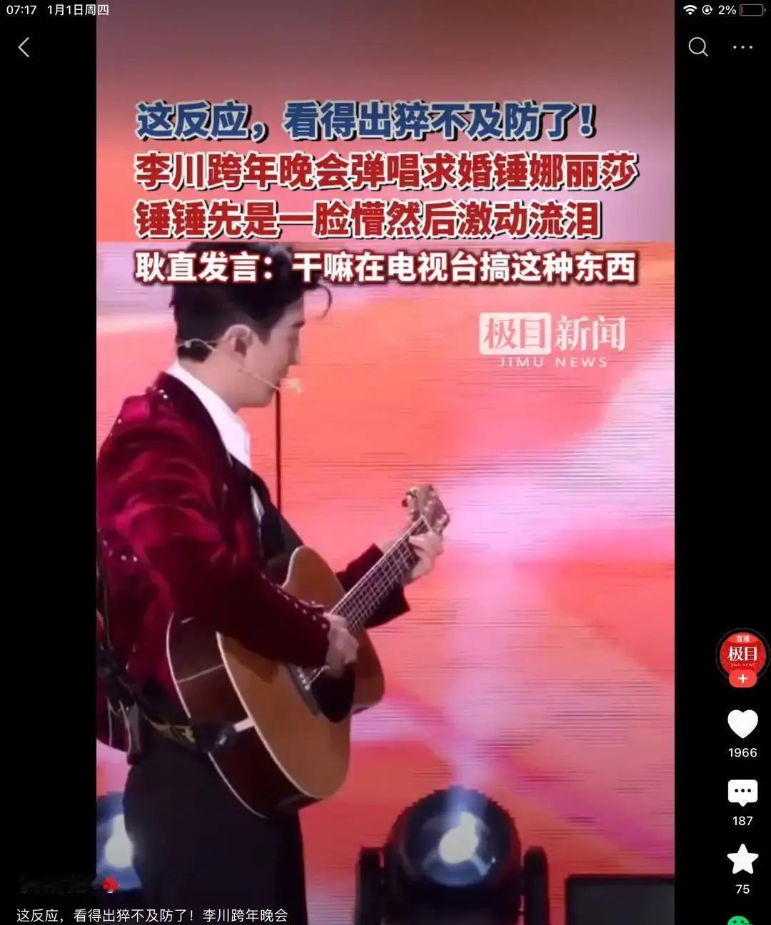 跨年夜求婚翻车现场 锤娜丽莎刚唱完第一句,李川举着戒指冲上台。她愣了三秒,话