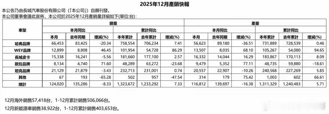 建哥看本质 长城这2025年成绩单,稳是稳,但细看全是戏啊!全年卖了132万多台,涨了7%,听着不错吧?但12月单月销量和产量都在跌,看来年底冲劲不太足。品牌方面真是冰火两重天:哈弗作为老大,12月销量同比跌了20%,全靠年初扛着才保住全年增长;WEY倒成了黑马,全年销量几乎翻倍,12月更是暴涨46%,蓝山、拿铁这些混动车型看来是真吃香了。亮点有两个硬数据:海外卖了50.6万台,占总销量近40%,长城这出海步伐踩得是真猛;新能源车卖了40万台,但说实话,占总销量才30%出头,在如今这市场里比例还得加油。欧拉12月销量涨了70%多,可全年还在跌,波动有点大。坦克依然稳如老狗,皮卡基本盘也牢固。总体来说,长城这一年算是“守住了江山,但增量焦虑明显”:燃油车基本盘受冲击,新能源转型速度不如第一梯队猛,好在海外市场杀出来了。2026年能不能成,就看新能源这块短板能不能快点补上了!(数据来源:长城汽车2025年12月产销快报)