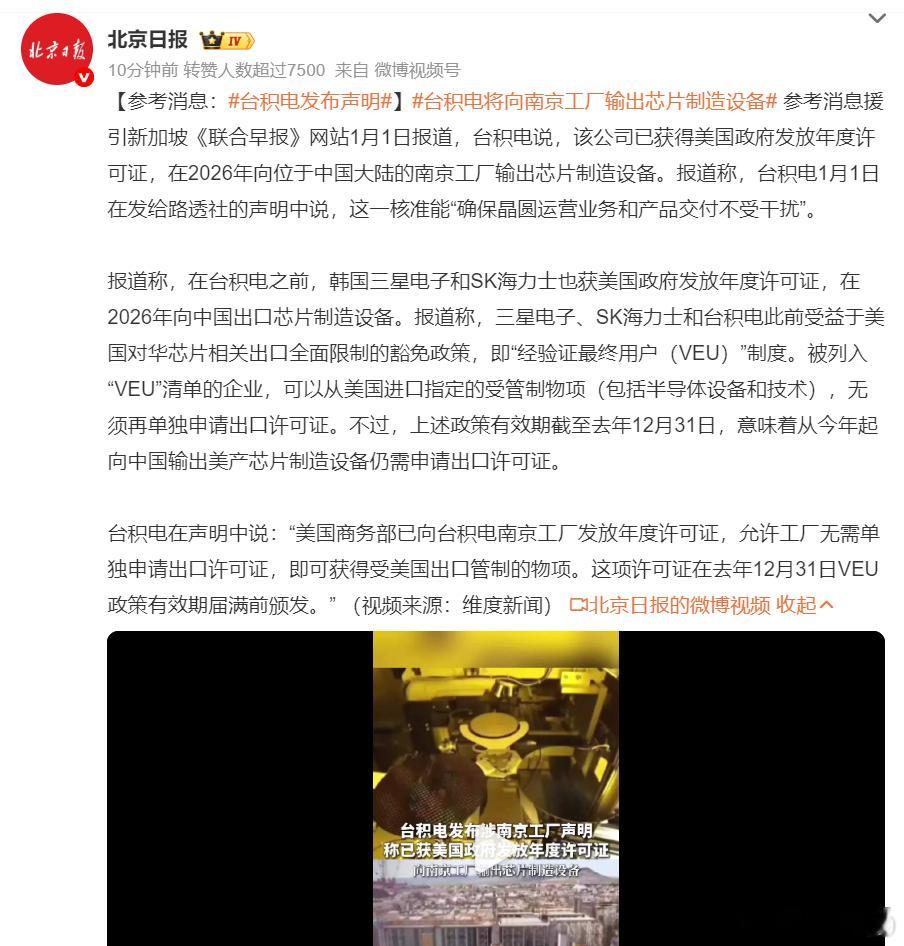 台积电说,该公司已获得美国政府发放年度许可证,在2026年向位于中国大陆的南京工厂输出芯片制造设备。在台积电之前,韩国三星电子和SK海力士也获美国政府发放年度许可证,在2026年向中国出口芯片制造设备。看来我们的芯片真的突破了台积电发布声明台积电将向南京工厂输出芯片制造设备