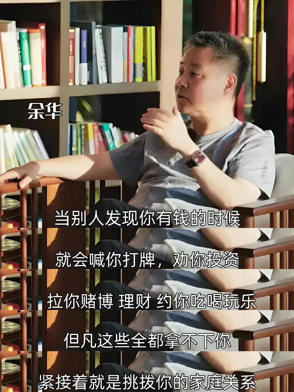 余华的这段话说得在理:当别人知道你有钱的时候会找你打牌,投资理财,只会吃喝玩乐。如果这些都拿不下,你接下来就是挑拨你的家庭关系。