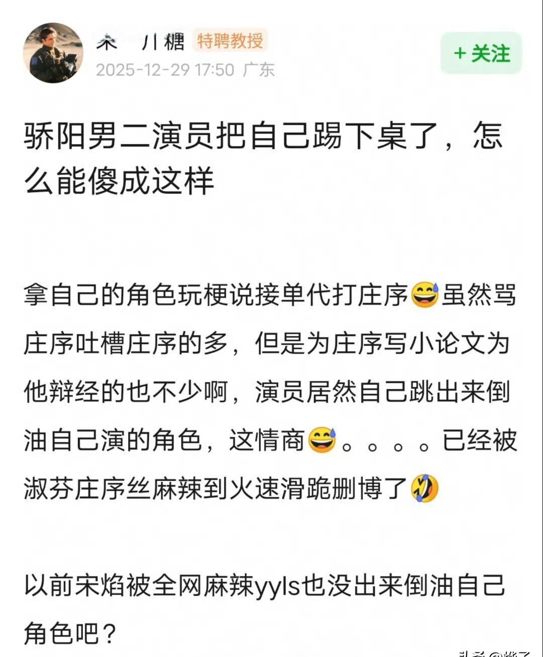 一个演员,演得越好,就越不能调侃自己演的角色。 赖伟明玩梗调侃庄序,瞬间引爆了粉丝的愤怒。 他低估了一件事:当观众深爱一个角色,他们会把一部分灵魂,暂时寄存在演员身上。 你轻飘飘的一句玩笑,砸碎的是别人的情感容器。 你以为你在调侃自己8小时的工作,他们守护的是自己100%的代入与信仰。 制作方发声支持,团队紧急道歉。 但裂痕已经产生。 这给所有创作者上了一课:角色一旦诞生,便拥有独立生命。 演员只是载体,而非所有者。 真正的敬畏,是懂得那份托付的重量。 你演绎的是一段时光,他们托付的是一部分自我。