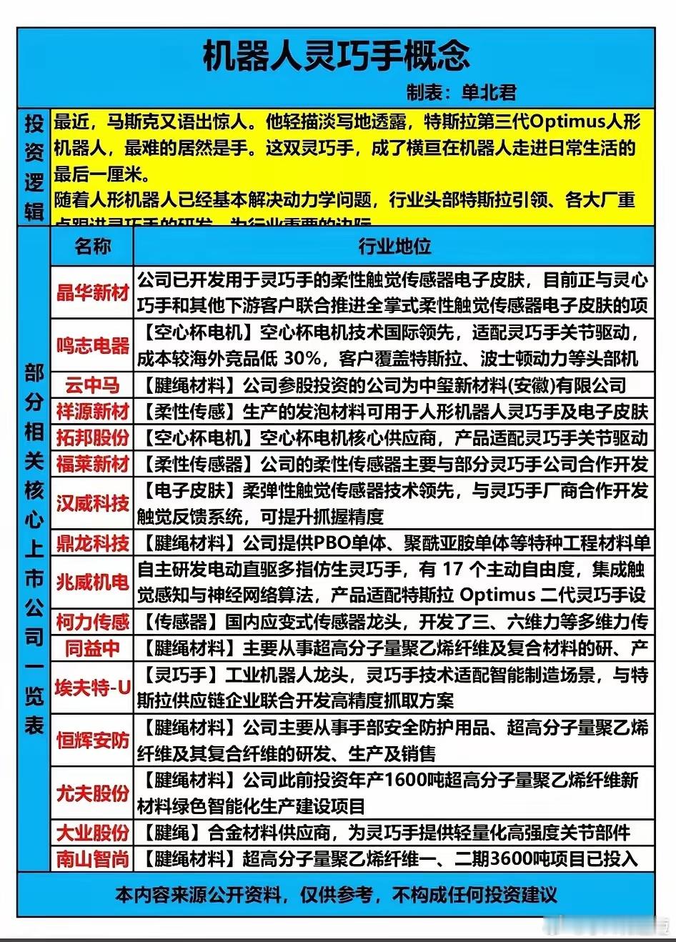 人形机器人+灵巧手成最后堡垒!这条隐秘产业链迎来爆发时刻马斯克直言特斯拉Optimus的“手”仍是难题,这恰恰暴露了人形机器人最关键的“最后一公里”——灵巧手,已成为资本必争之地。核心逻辑:当双足行走基本解决,仿人手的精细化操作就成为核心瓶颈与价值高地。其技术突破将直接打开万亿级人形机器人应用场景。产业链深度梳理(稀缺信息):1. 核心驱动:空心杯电机是“关节”,鸣志电器、拓邦股份技术领先,成本优势显著。2. 感知系统:柔性触觉传感器构成“电子皮肤”,晶华新材、汉威科技已与下游联合研发,这是实现触觉反馈的关键。3. 关键材料:超高分子量聚乙烯纤维等“腱绳材料”决定手部力度与寿命,同益中、南山智尚等公司深度布局。独到观点:灵巧手非单一技术,而是电机、传感、材料、算法的集成体。当前主力资金正沿着“核心部件国产替代”与“材料创新”两条暗线深度挖掘。得灵巧手者,将在人形机器人量产时代掌握核心价值链。(投资有风险,内容仅供参考)机器人行业特斯拉机器人机器人制造产业机器人产业人形机器人工厂特斯拉智能制造机器人柔性手指轮足人形机器人全人形机器人人形机器人股票
