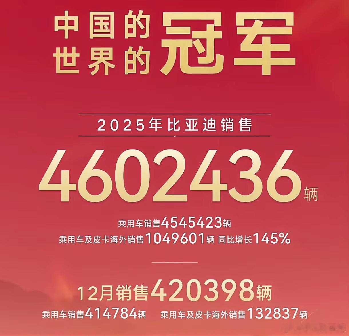 快讯:比亚迪12月份销量420398台,同比下降18.34%,环比下降12.45%。2025年全年销售4602436辆,同比增长7.73%;其中海外年销量首次突破100万辆,同比增长145%。比亚迪再度蝉联三项桂冠:♦全球新能源车市场销量冠军♦中国汽车市场车企销量冠军♦中国汽车市场品牌销量冠军作为对比:中国一汽12月份销量30.70万辆,全年累计销量330.19万辆:吉利汽车12月份销量23.68万辆,全年累计销量302.46万辆;长城汽车12月份销量12.40万辆,全年累计销量132.37万辆。比亚迪销量汽车销量