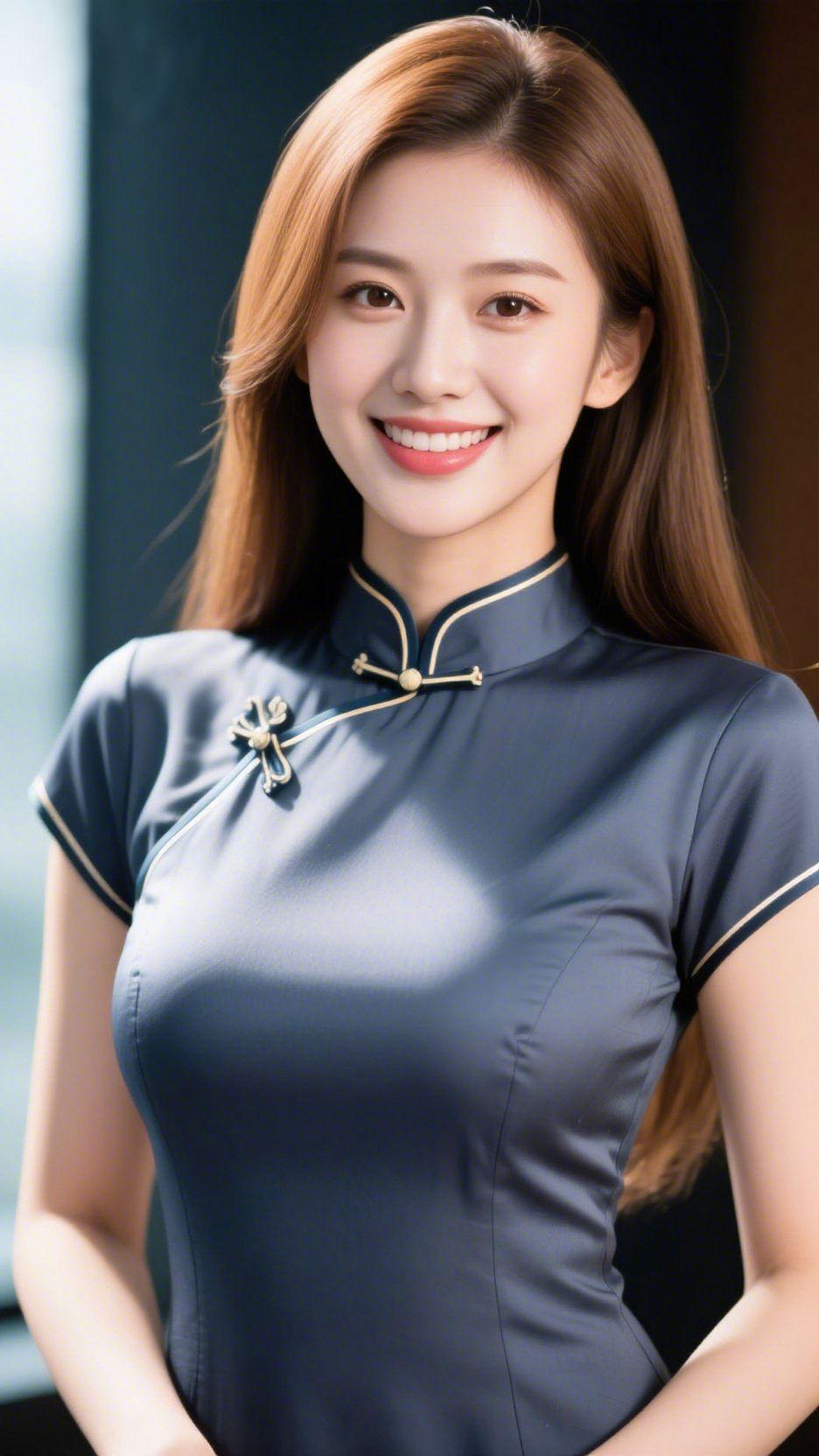 《黛襟金扣的温雅》 黛色缎面如暮色轻裹的云,襟边金纹是揉碎的星芒,盘扣轻缀似檐角垂落的光,将温沉揉进衣间。 她笑时,梨涡盛着软光,长发垂落的弧度像风抚过的丝绦——没有繁饰的张扬,只有藏在简约里的雅,像案头瓷瓶里的素菊,清浅,又带着漫不经心的暖。 这是烟火日常里的轻柔片段,是黛与金织就的东方意趣,落在眼底,便成了寻常时光里忽然撞进心尖的欢喜。 旗袍雅韵 黛衣金扣