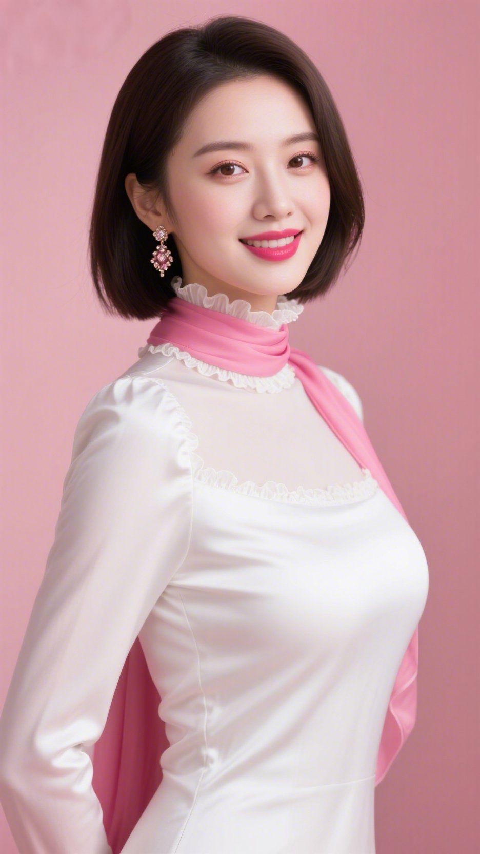 《白衫粉巾的清甜》 月白衣料如晨露轻裹的云,领口蕾丝是揉碎的细雪,粉巾柔绕颈间,将春樱的软意融在日常。 她笑时,唇色是淡晕的桃色,短发垂落的弧度像风抚过的花瓣——没有张扬的艳,只有藏在素净里的甜,像瓷盘盛着的米糕,清浅,又带着漫不经心的暖。 这是烟火时光里的细碎温柔,是白与粉织就的轻甜意趣,落在眼底,便成了寻常日子里撞进心尖的欢喜。 柔甜穿搭 白衫粉巾