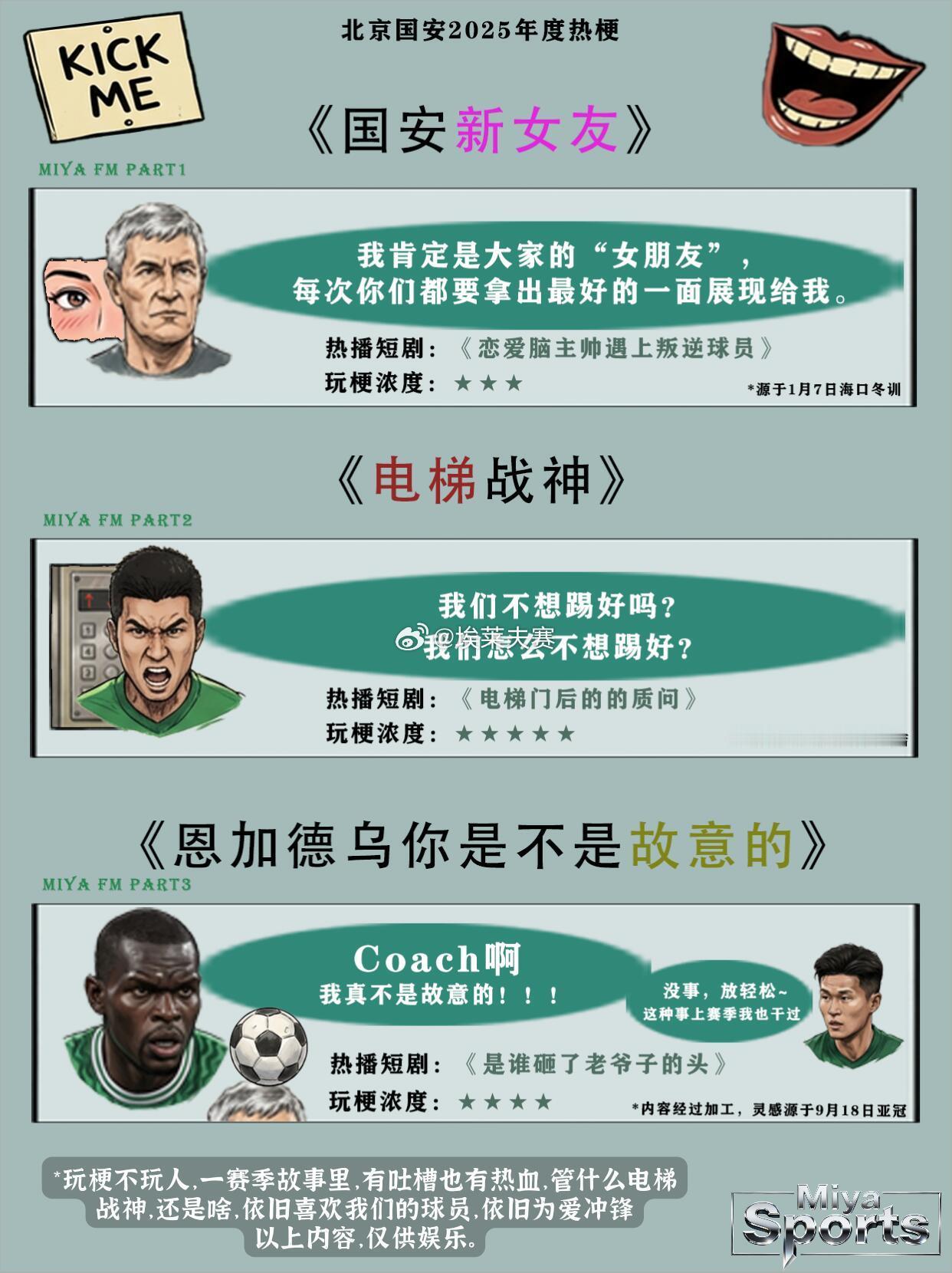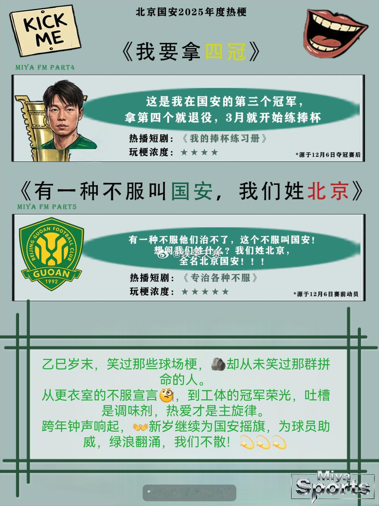 北京国安北京国安 2025北京国安热梗统计!笑梗娱乐不笑人❤️2025被国安的梗承包啦!塞蒂恩“未来一年我是你们女朋友”的发言,如今回看堪称神预言😂 还有电梯门的故事,从酒店到决赛拼伤,最后笑着把梗设成铃声,反转太好哭🙃~最燃的还是足协杯夺冠🥇!法比奥帽子戏法封神,稀哲练习捧杯的采访,再时隔7年再捧杯的瞬间直接泪目,笑梗不笑人🤭每段梗都藏着热爱与拼杀。跨年夜将至,🔥祝国安球迷新年喜乐,新赛季继续为绿魂呐喊,工体见!……
