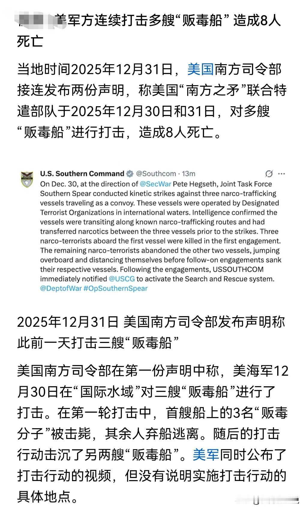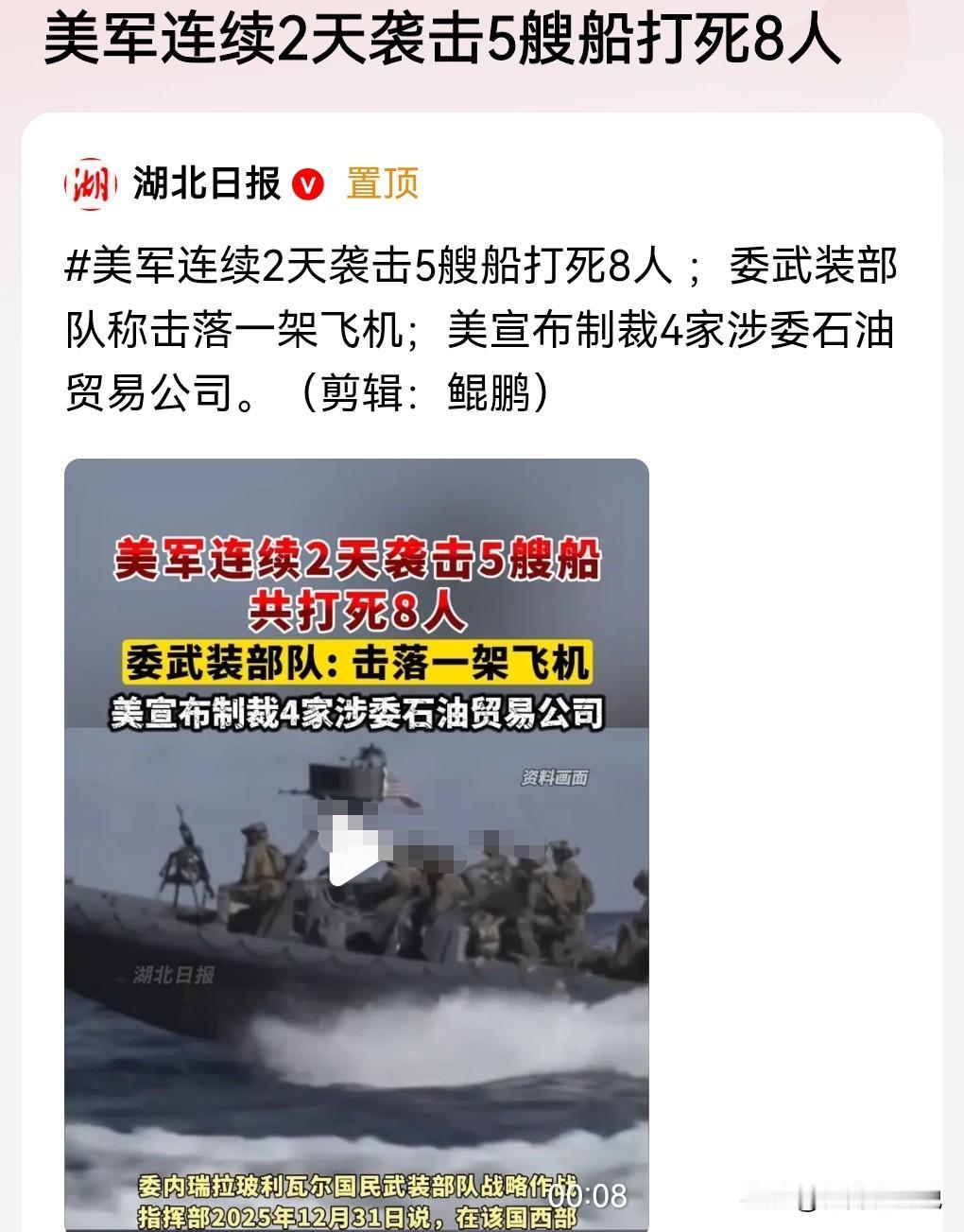 丧心病狂的美国又在干坏事了。 近日,美军连续2天袭击5艘船打死8人。 这真的是无法无天。 不用经过审判,就把人直接给击毙了。 然后给对方扣一个贩毒的罪名。 这真的是没有一点底线了。