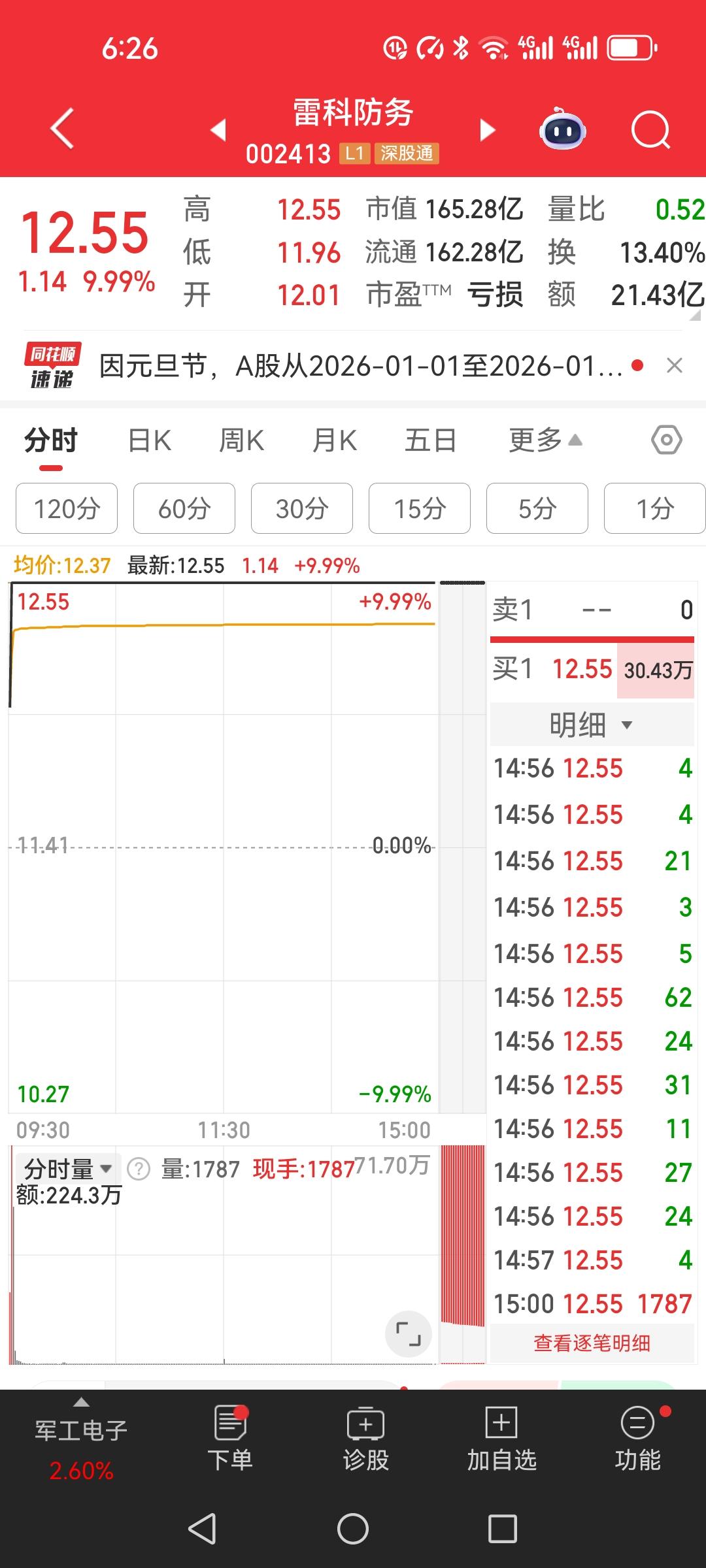 连续四年亏损的雷科防务为什么能连续涨停三连板,难道是散户合力“造妖”吗? 军工板块股雷科防务近最近涨势凶猛,一连三个涨停板,还是缩量上涨,股价从6元启动,已经翻翻了,现在到了12块多。从基本面看,公司股权比较分散,十大流通股东才仅占9%、连续四年净利润亏损。 就是这么一家公司,却成为市场的新宠,难道就是因为他是军工板块,价位低,赶上了军工题材的风口。 你们认为现在还能上车吗?看着这么强势的走势,有点忍不住要上车的感觉,但又怕山顶,成为最后一个接力棒。 有买过雷科防务的吗?谈谈你们的看法,我是节后卖不卖,给点建议?军工股行情 军工概念股票 军工概念股