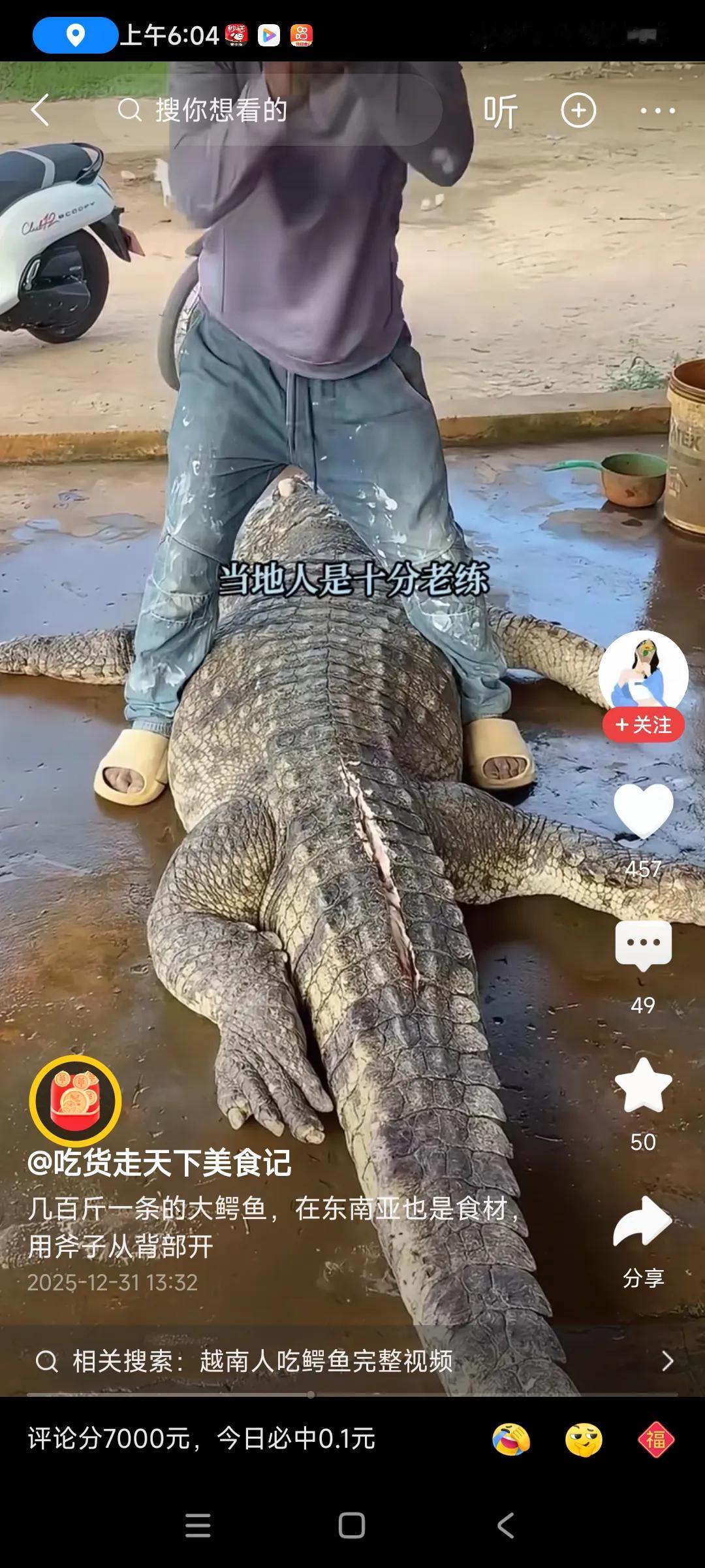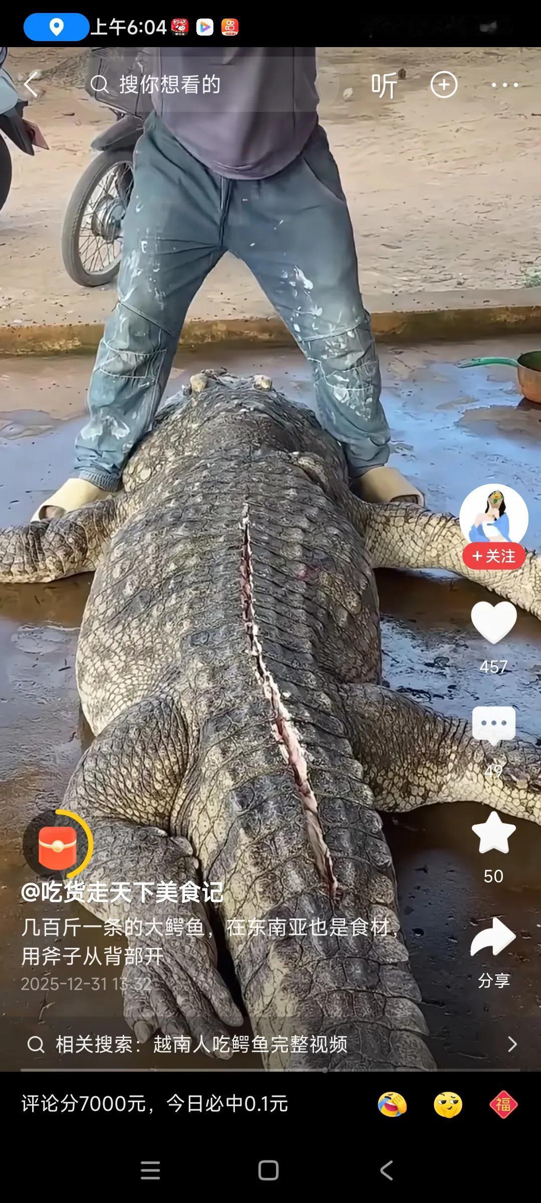 老外太牛了,几百斤重的鳄鱼,肉用来做美食,皮用来做真皮腰包,价值几千元,,, 这个鳄鱼凶神恶煞,是水中一霸,下场很惨,,[捂脸][捂脸][捂脸]