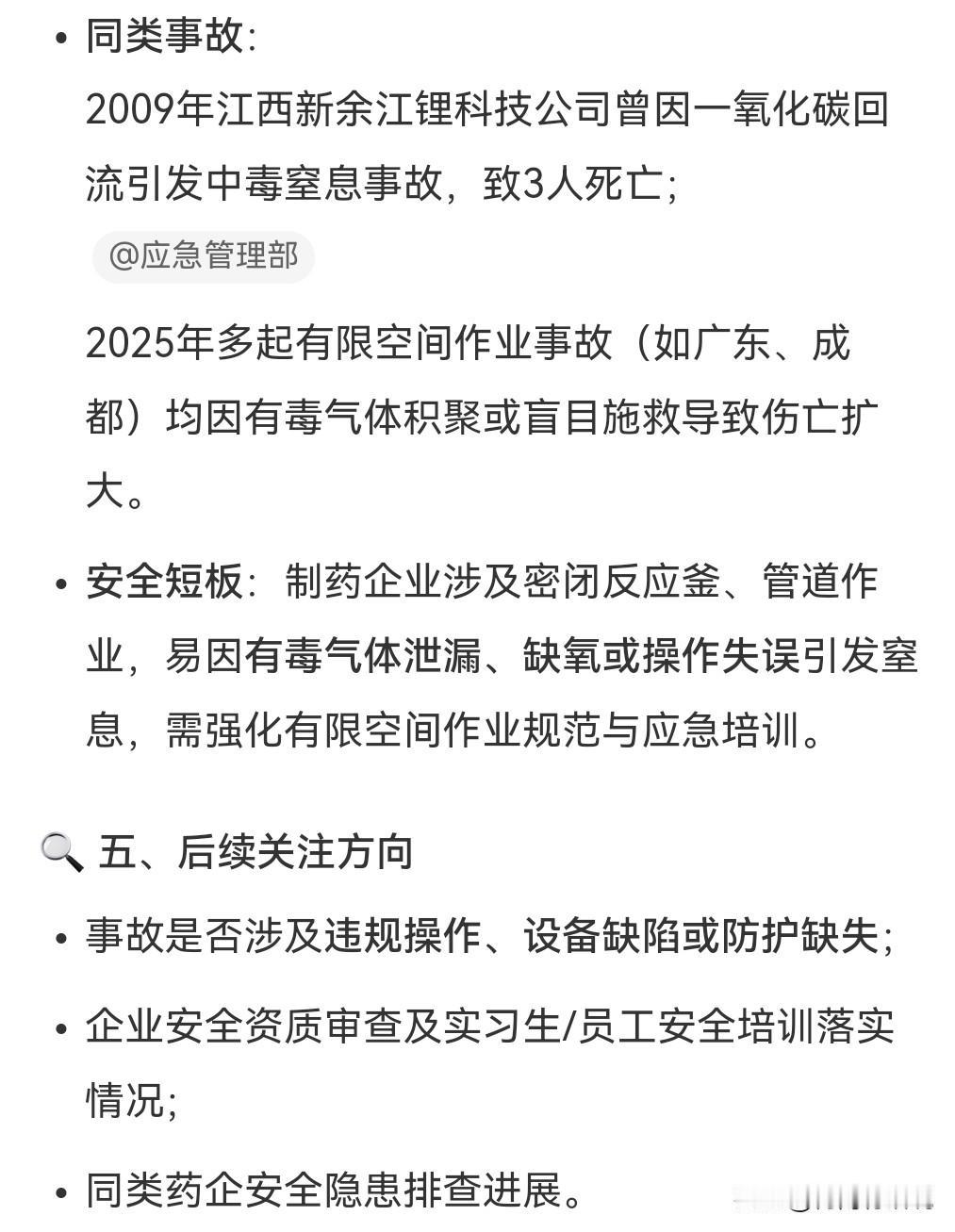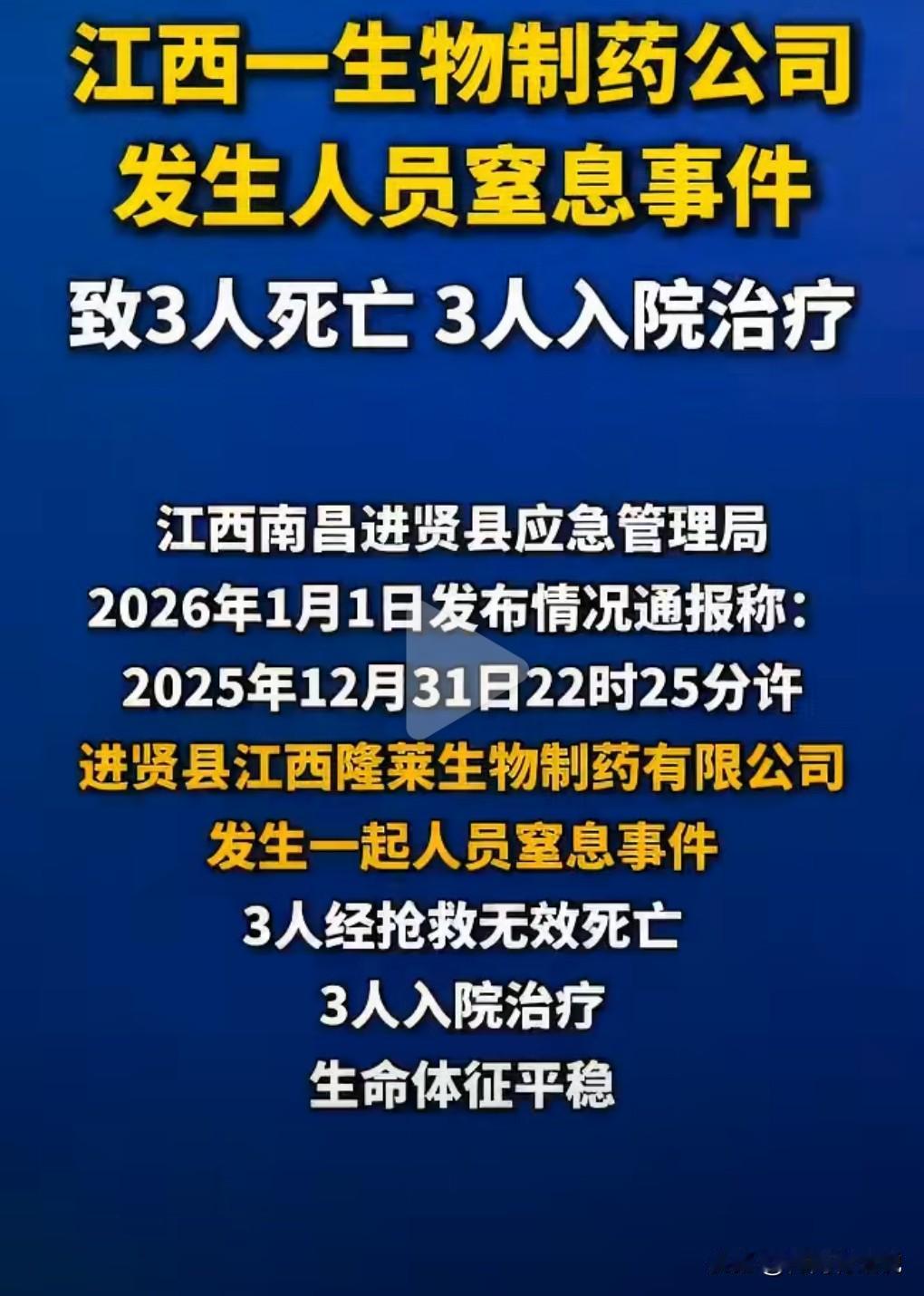 这真的是太悲剧了,竟然又发生这种死亡事件。 2025年12月31日22时25分许,南昌一生物制药公司发生人员窒息事件。 此事件也是特别的悲痛,导致了3人死亡,3人入院治疗。 也希望这3人能够早日康复。 像这样的事件也是经常被报道的,一定要注意了。 年关将至,一定要小心为上。 希望大家都平平安安的过新年。
