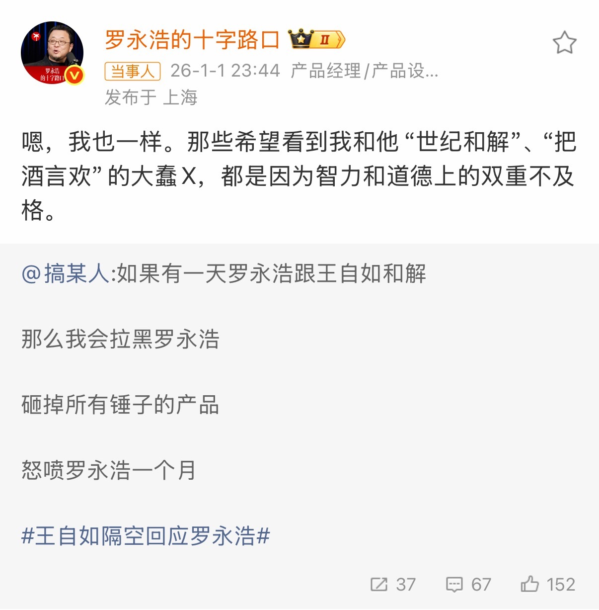 哈哈哈,正主回应了,都放心了吧。罗永浩回应是否与王自如和解