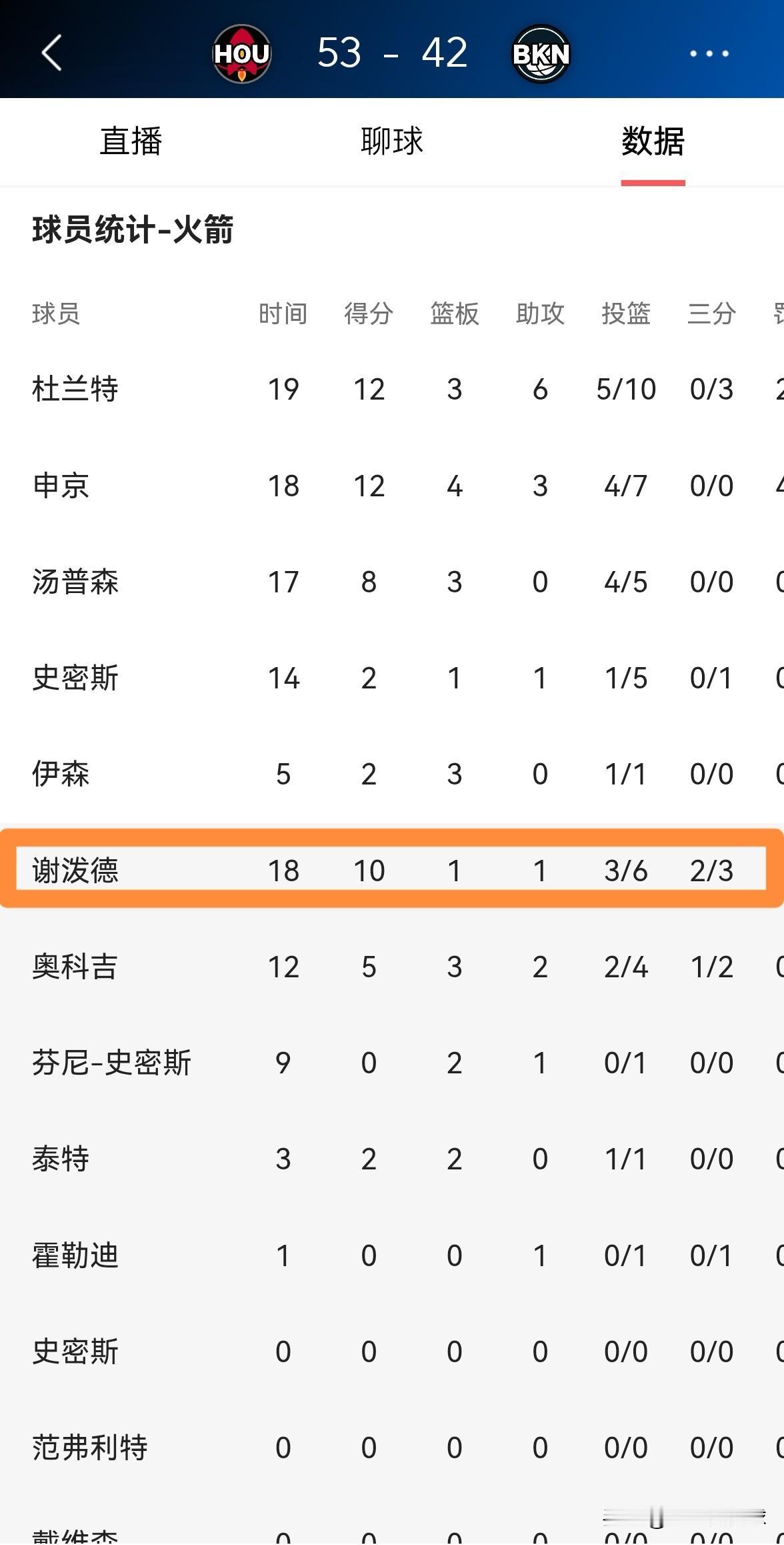 火箭超级新星谢波德的三分手感终于回来了!在今天火箭客场挑战篮网的比赛中,目前双方半场战罢,火箭以53:42领先对手。在前两节比赛中,谢波德终于找回了久违的三分手感,他在替补出战的18分钟里,投篮6中3,其中三分球3中2、罚球3中2得到10分,还有1篮板1助攻1盖帽,他的场上正负值为+2。 坦白说,当谢波德能够在三分线外频频投进三分球时,火箭的进攻将会变得更加流畅。