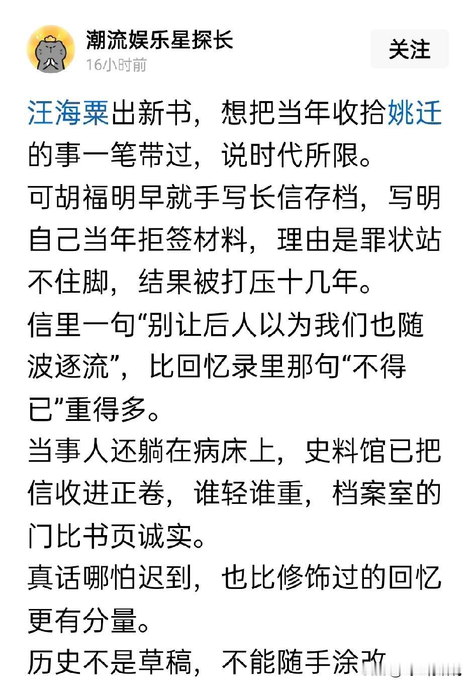 事实证明,有些人至死都不会认错,而是换着法儿写书来为自己洗白,甚至美化自己 关于姚迁自杀的一事,有组织的平反和追责,更有知情人胡福明当时的书信证据 而主要责任人至死都没有认为自己错了 把一个正直无私的文化人逼上绝境,却在自己的笔下全面美化自己当时的宽大之心 这样的人,这样在书中自我变白也是让人难以理解 为什么好多大人物在自己蒙冤之时拼命哭诉,而在冤枉他人的时候却显得心安理得 一个人的功过是非,本应该让历史和后人来评价 偏偏有人喜欢自说自评,写下所谓的回忆 这样的文字,往往会美化和洗白一些当事人经历的历史事件
