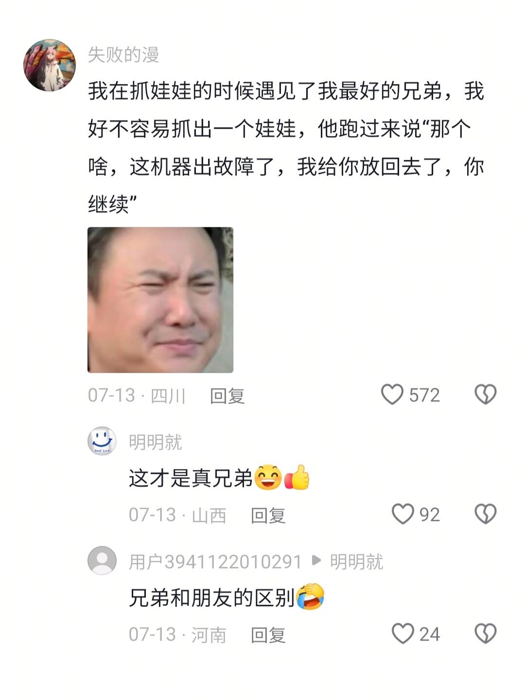 我在抓娃娃的时候遇见了我最好的兄弟,我好不容易抓出一个娃娃,他跑过来说"那个啥,这机器出故障了,我给你放回去了,你继续"