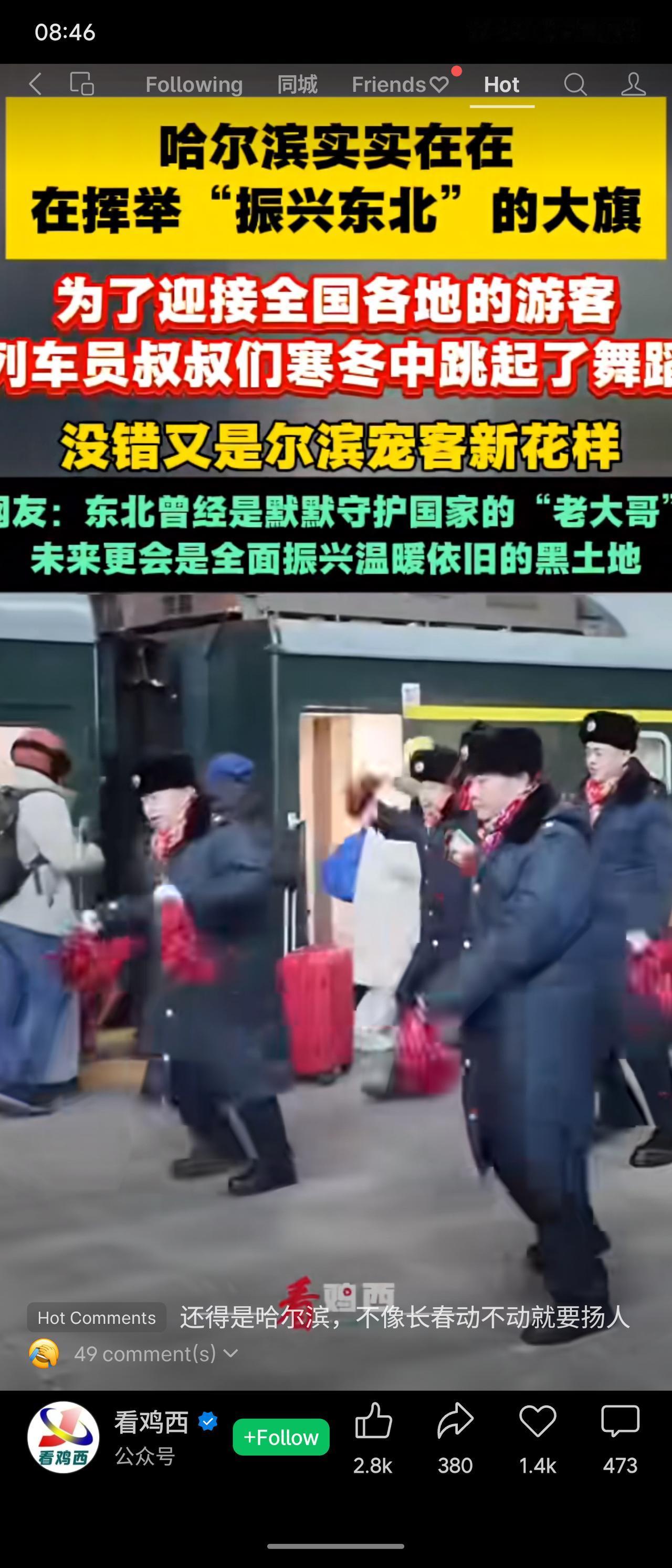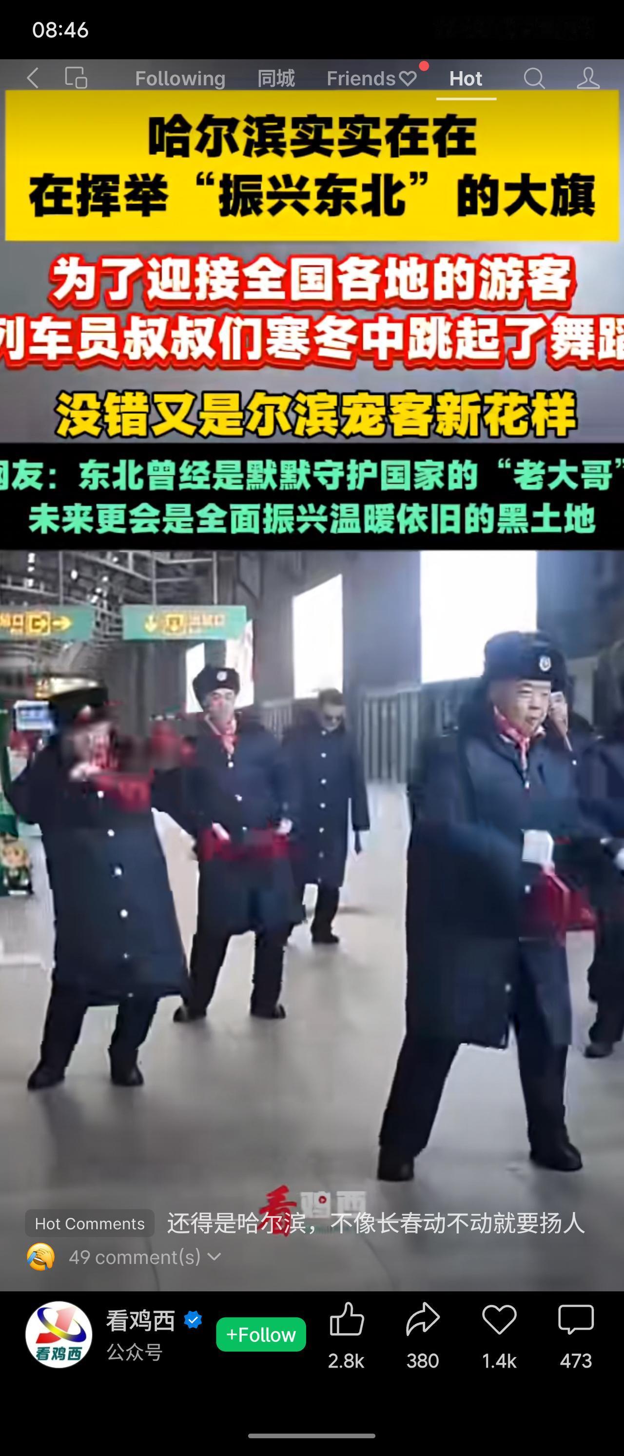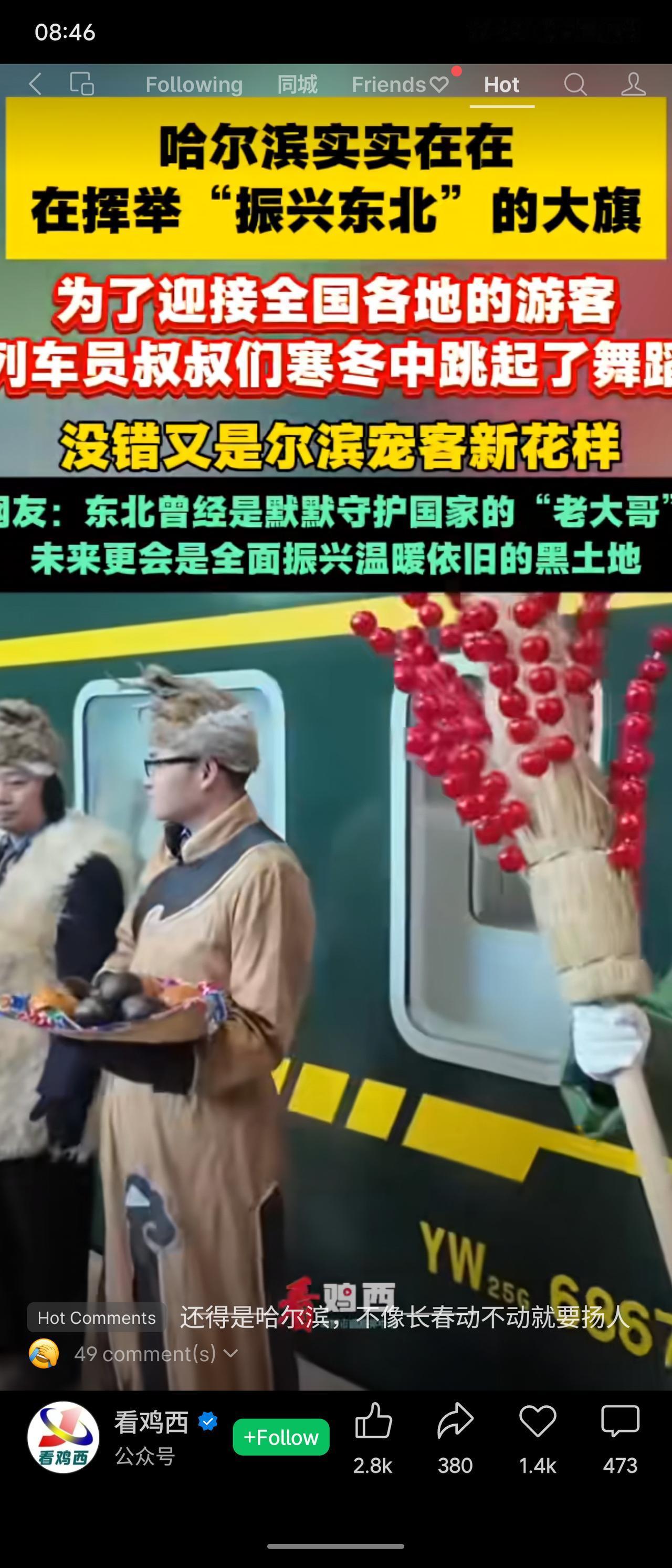 哈尔滨正高举“振兴东北”旗帜,为迎游客,车员叔叔寒冬中跳舞。东北曾是守护国家的“老大哥”,未来将全面振兴黑土地。网友评论调侃哈尔滨与长春对比。