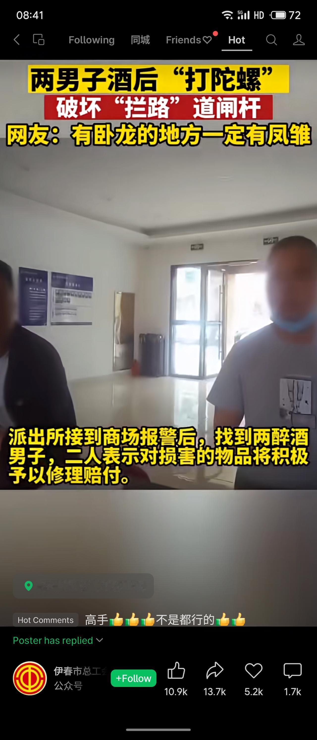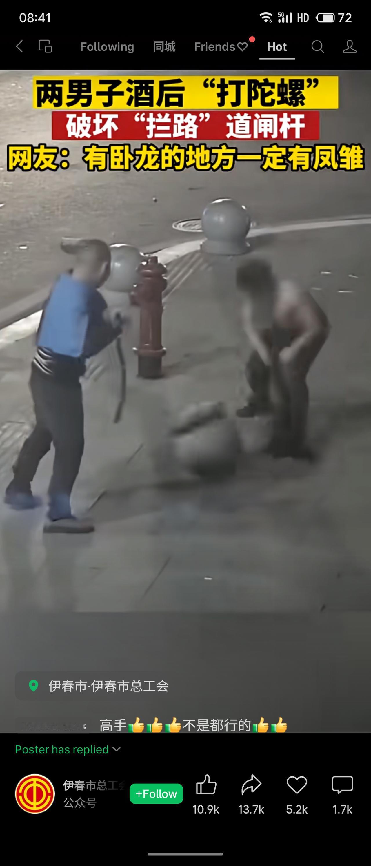 黑龙江伊春两男子酒后以“打陀螺”方式破坏道闸杆,被网友戏称“有卧龙必有凤雏”。事件由伊春市总工会发布,引发关注,评论区多调侃其行为。