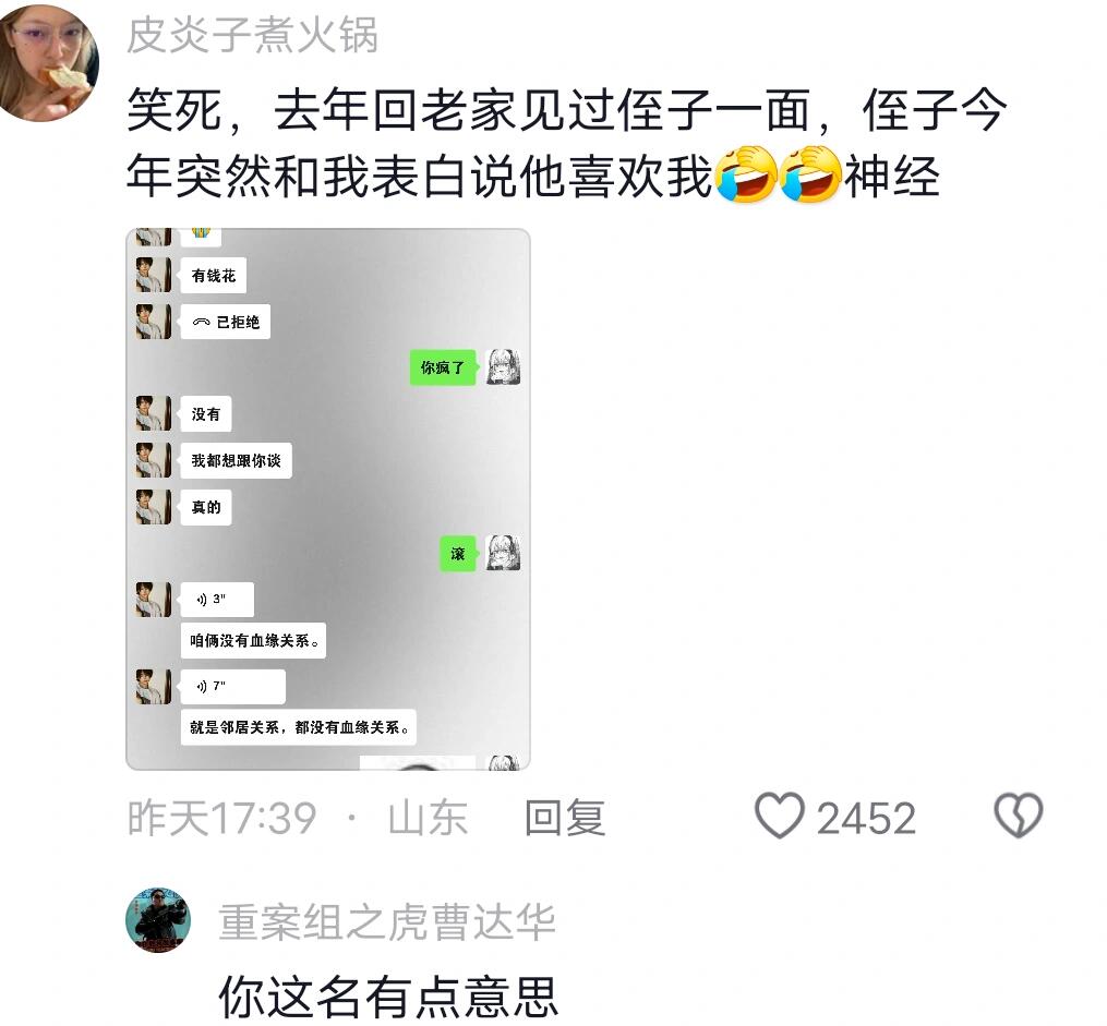 笑死,去年回老家见过侄子一面,侄子今年突然和我表白说他喜欢我神经