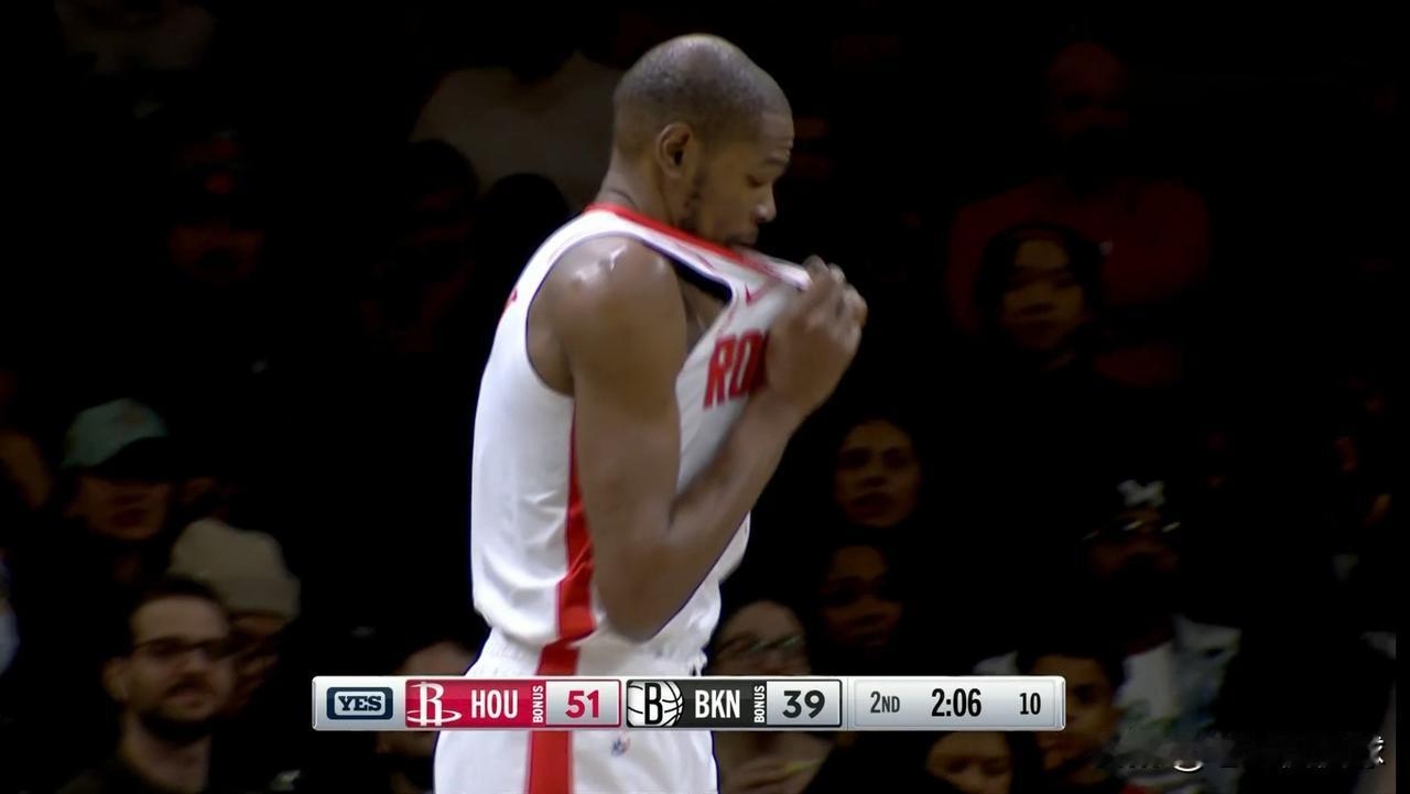 火箭超级巨星杜兰特真是怒了,他忍不住当场大爆粗口!在今天火箭客场挑战篮网的比赛中,当时比赛进行到了第二节的两分多钟,篮网球员沃尔夫的三分投篮打铁后,球结结实实的砸到了杜兰特的面部,这下可把杜兰特给疼坏了,只见杜兰特非常生气的说道:“投得什么垃圾玩意儿。”