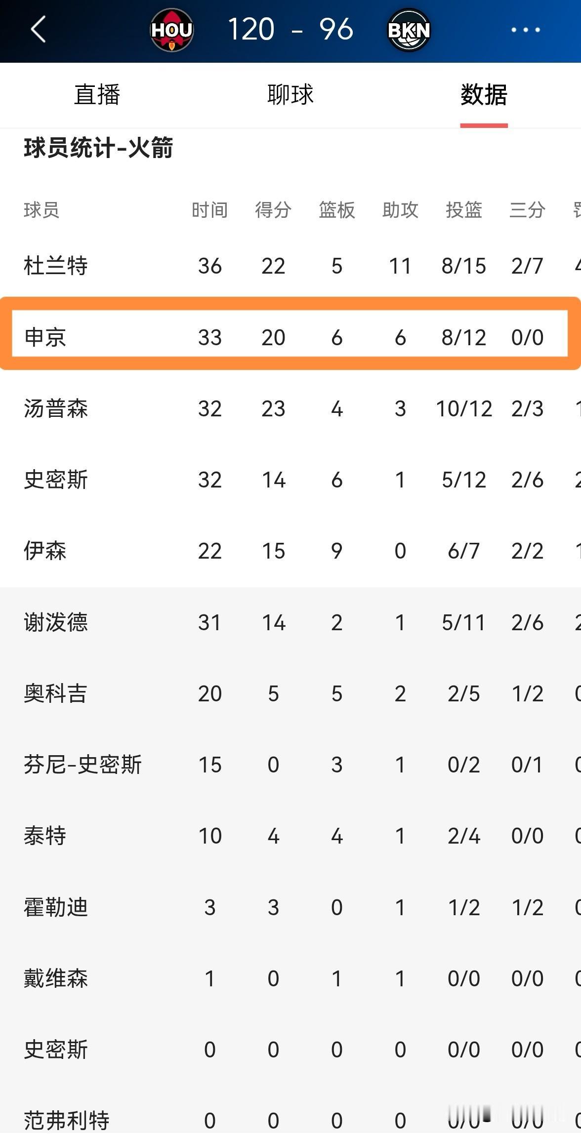 我忍不住要怒赞火箭当家中锋申京!在今天火箭客场以120:96大胜篮网的比赛中,申京打出了非常精彩高效的表现,是球队能够获胜的大功臣。 全场比赛下来,申京首发出战33分钟,投篮12中8,其中罚球6中4非常高效的砍下20分6篮板6助攻2抢断1盖帽,他的场上正负值为全队最高的+30。 值得一提的是,本场比赛申京没有出手三分球,这说明申京完全以正确的方式打球。