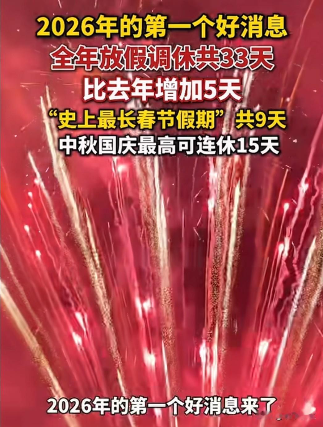 2026年,我国法定节假日放假调休天数将增至33天,比2025年增加5天。这一调整不仅是近年来最大幅度的节假日天数增加,更体现了国家对劳动者休息权的重视和对消费市场的积极引导。 跟国外比,33天的法定节假日天数已经超过了许多发达国家,像美国(10天)、日本(16天)和德国(16天)。这一调整将使我国劳动者的年休假天数达到国际中上水平,有助于提高劳动者的生活质量和工作效率。 值得注意的是,此次节假日调整不仅增加了天数,还优化了放假安排。比如春节假期将从7天延长至9天,国庆假期从7天延长至8天,同时增加了"五一"劳动节的放假天数。这种安排既考虑了传统节日的文化意义,又兼顾了民众的出行需求,有助于缓解节假日集中出行带来的交通压力。