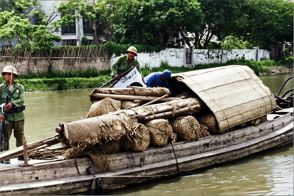 1939年6月21日,侵华日军突袭并占领汕头。照片中,一艘载满物资的木制小舟沿河道航行,舟上堆叠着竹编篮子、麻袋和竹竿等货物,可能用于后勤补给。舟尾有日军士兵手持步枪警戒,一人站在舟上持旗。 1939年6月6日,日本大本营下达命令,攻占汕头以封锁中国华南沿海,切断海外援助物资,汕头当时是广州沦陷后华南最后主要对外港口。6月21日拂晓,日军第21军部分部队在海军第5舰队支援下,分多路登陆,另有部队乘舟沿江而上,进入市区切割守军退路。中国守军奋力抵抗,但因兵力分散且遭突袭,次日汕头沦陷。此战为第二次中日战争相持阶段的一部分,日军旨在加强沿海封锁。