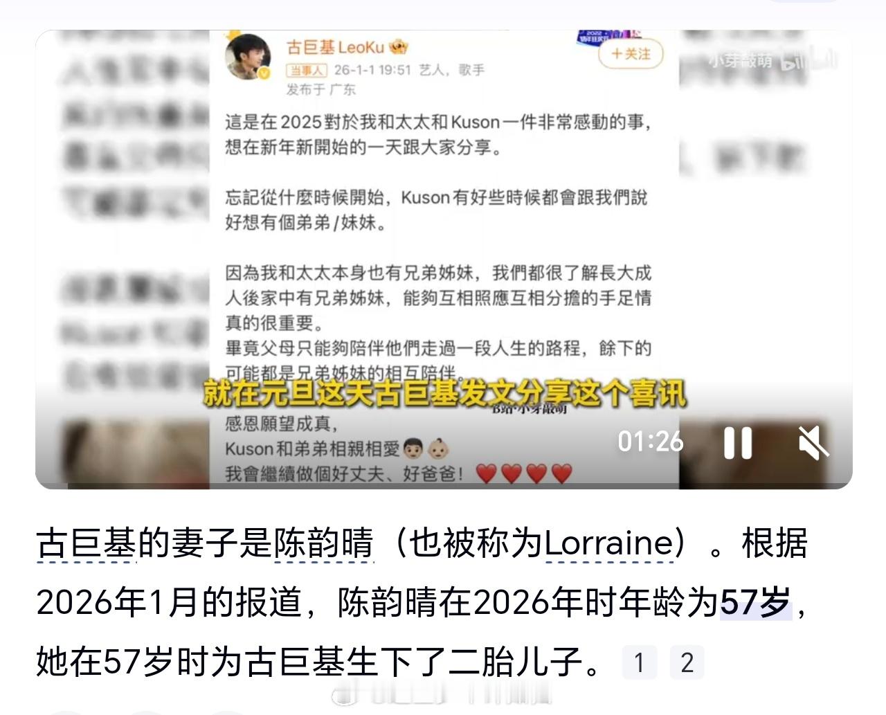 古巨基有二胎了,他老婆比他还大几岁(58 岁),快60了还要二胎吗。。真的是医学奇迹老来得子啊