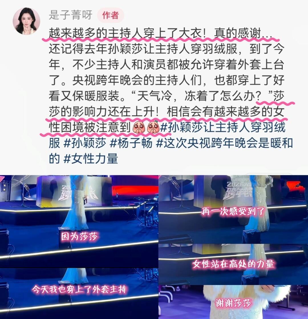 莎莎说的话,真的都虚心接受,去年莎莎希望主持人也可以穿上羽绒服,今年就都穿上了厚厚的外套,不过真的很好看! 孙颖莎影响力杠杠的,温暖了所有人,想到莎莎就是如此的光芒万丈,温暖到心田! 一句句的感谢,千言万语汇成一句,孙颖莎不止在体育,还在方方面面的影响力!
