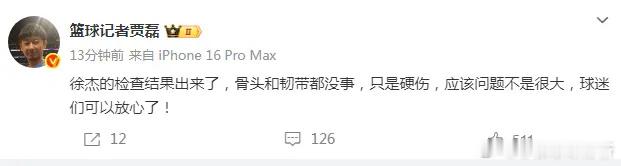 徐杰检查结果出炉:骨头韧带没事属于硬伤 问题不大可以放心北京时间1月1日,广东客场74-105惨负北京终结开局8连胜,徐杰的伤退成为备受瞩目的事情。赛后,广东主帅杜锋透露已经送去医院拍片,同时表示徐杰受伤后年轻球员没有顶上来,还谈到曾凡博希望他远离伤病多为国家队做贡献。篮球记者贾磊最新报道表示:“徐杰的检查结果出来了,骨头和韧带都没事,只是硬伤,应该问题不是很大,球迷们可以放心了!”广东在前8轮是唯一保持全胜的球队,但面对上一轮刚遭遇赛季首败的北京对决,广东竟然以74-105狂输31分。广东全场有3节比赛得分不足20分,攻防乏力成为广东输球的根源。广东本土后场核心之一的徐杰仅首发登场14分23秒,就提前受伤退赛,他在周琦被萨姆纳撞倒之后,徐杰被周琦连带撞到膝盖受伤,导致无奈被背下场退赛。徐杰退赛之前,仅有3中0与罚球2中1,得到1分1篮板1助攻1犯规,在场正负值-13。杜锋赛后接受采访表示:“首先祝全国球迷元旦快乐,2026年第一场比赛,今天我们在防守端不是很好,让对方进了18个三分,将近50%的命中率,这样肯定很难赢球。”“队员还是太年轻,徐杰受伤以后去医院拍片了,在人员轮转这一块很困难。大家还是有点紧张,王洪泽也好,陈家政也好,在场上不知道干些什么,我觉得这是年轻队员成长必须要经历的事情,2026年我们还会朝着好的方向继续努力。”杜锋也谈到曾凡博回归后带给北京的作用,同时希望曾凡博远离伤病,为国家队也多做贡献。