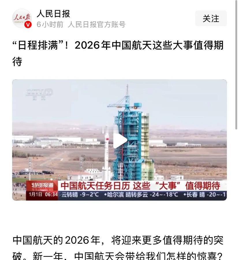 人民日报和央视发布重磅利好消息,2026年中国航天日程排满:2026年1月1日人民日报官方账号发布重磅利好消息,央视也报道了,2026年中国航天日程排满。这意味着节后商业航天还会有跨年行情。2025年12月初我就说了,商业航天无论是产业规模还是技术含量,都比当年的低空经济要强很多,所以无疑会是跨年主线,看到的人12月逆势赚大钱了。估计一月商业航天还有行情,不信点赞关注节后再看。