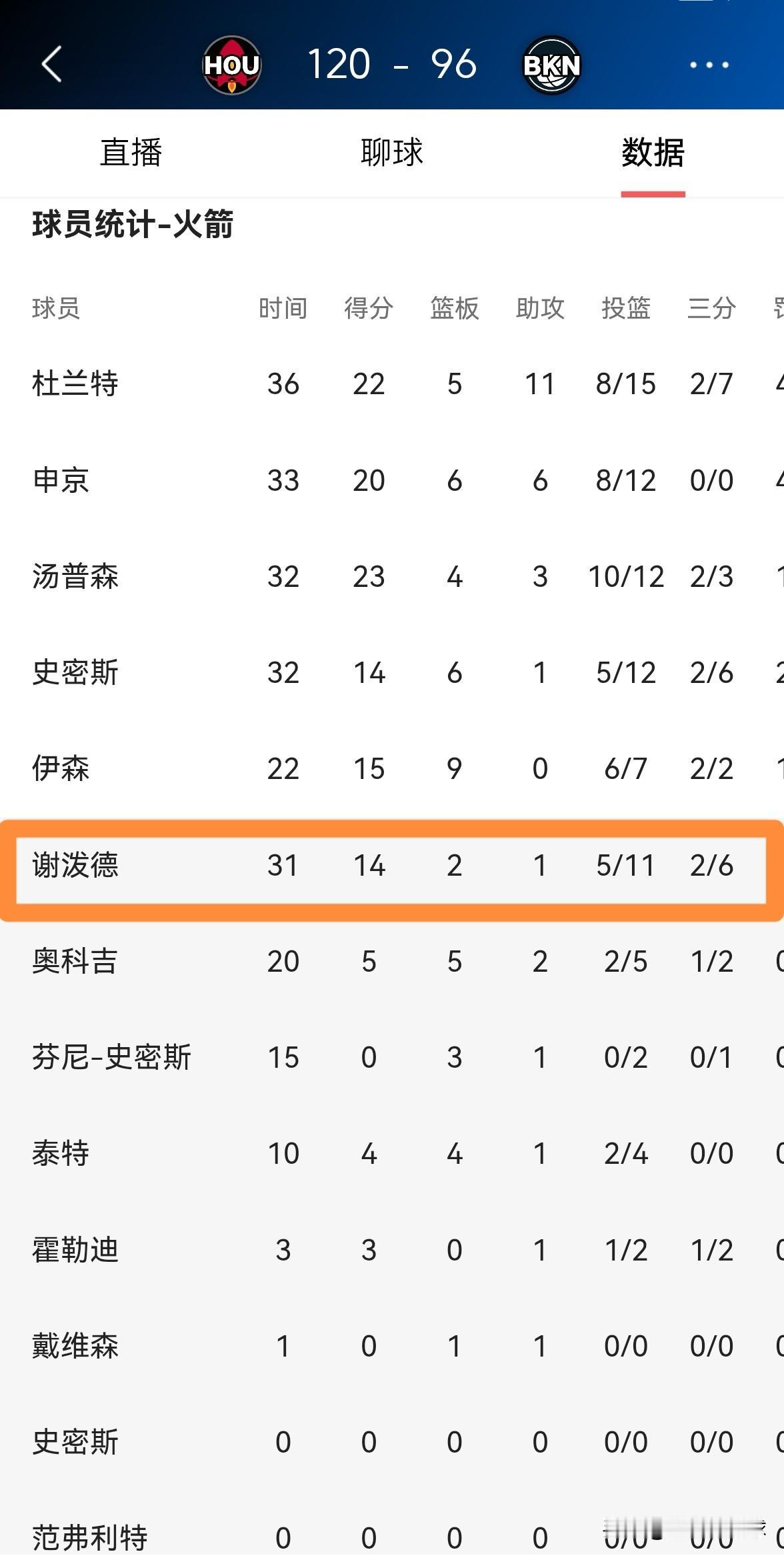 我真是越来越欣赏火箭小将谢波德了!在今天火箭客场以120:96大胜篮网的比赛中,谢波德替补出战31分钟,投篮11中5,其中三分球6中2、罚球3中2得到14分,还有2篮板1助攻1抢断3盖帽,仅仅出现了1次失误。 虽然谢波德仅仅是一名二年级球员,但是他目前的比赛风格非常稳健,给人一种少年老成的感觉。此外,本场比赛谢波德展现出了极佳的封盖意识,奉献了全队最多的3记盖帽。