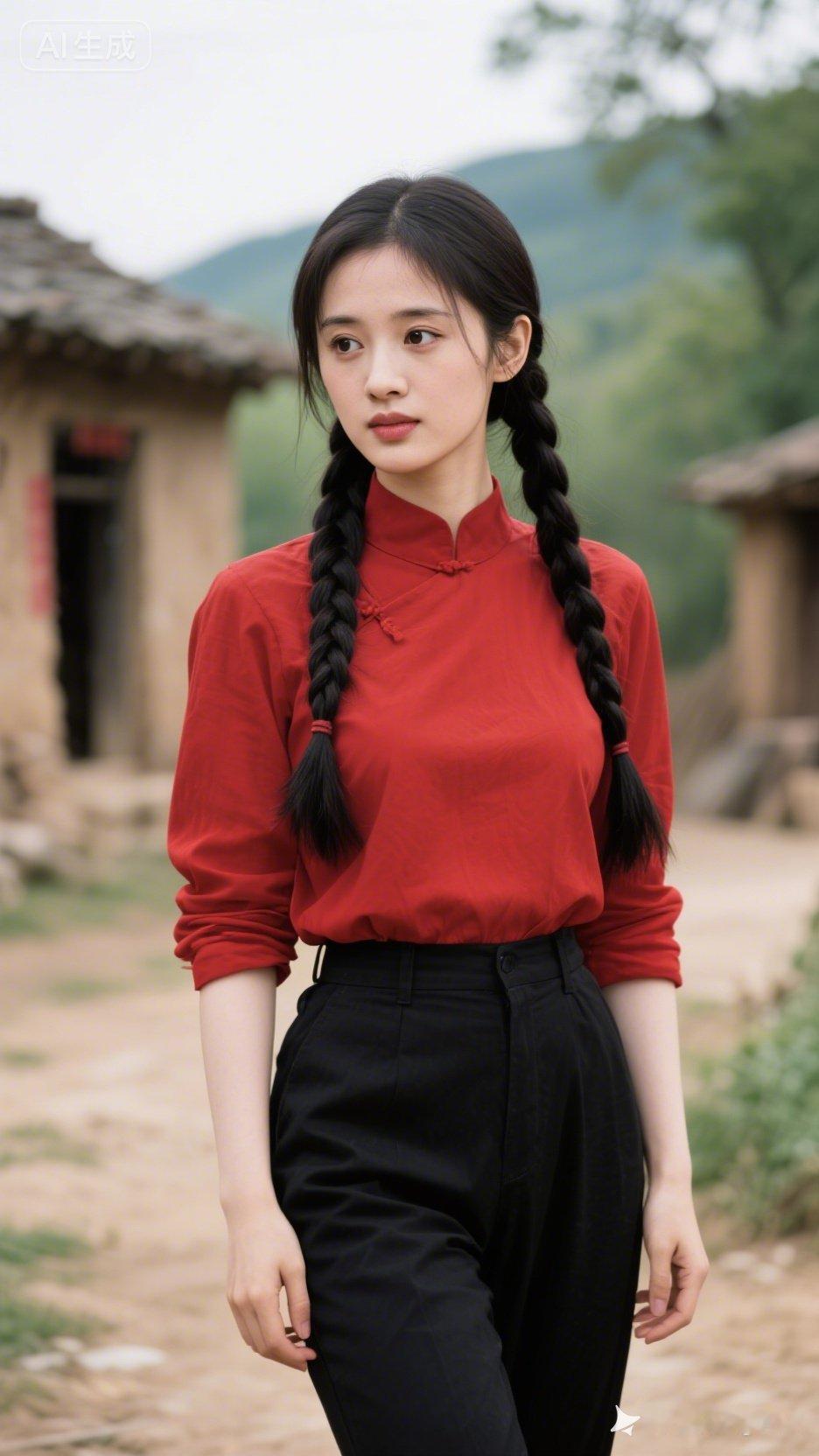 红衣少女漫步古村落,双辫飘逸,岁月静好。