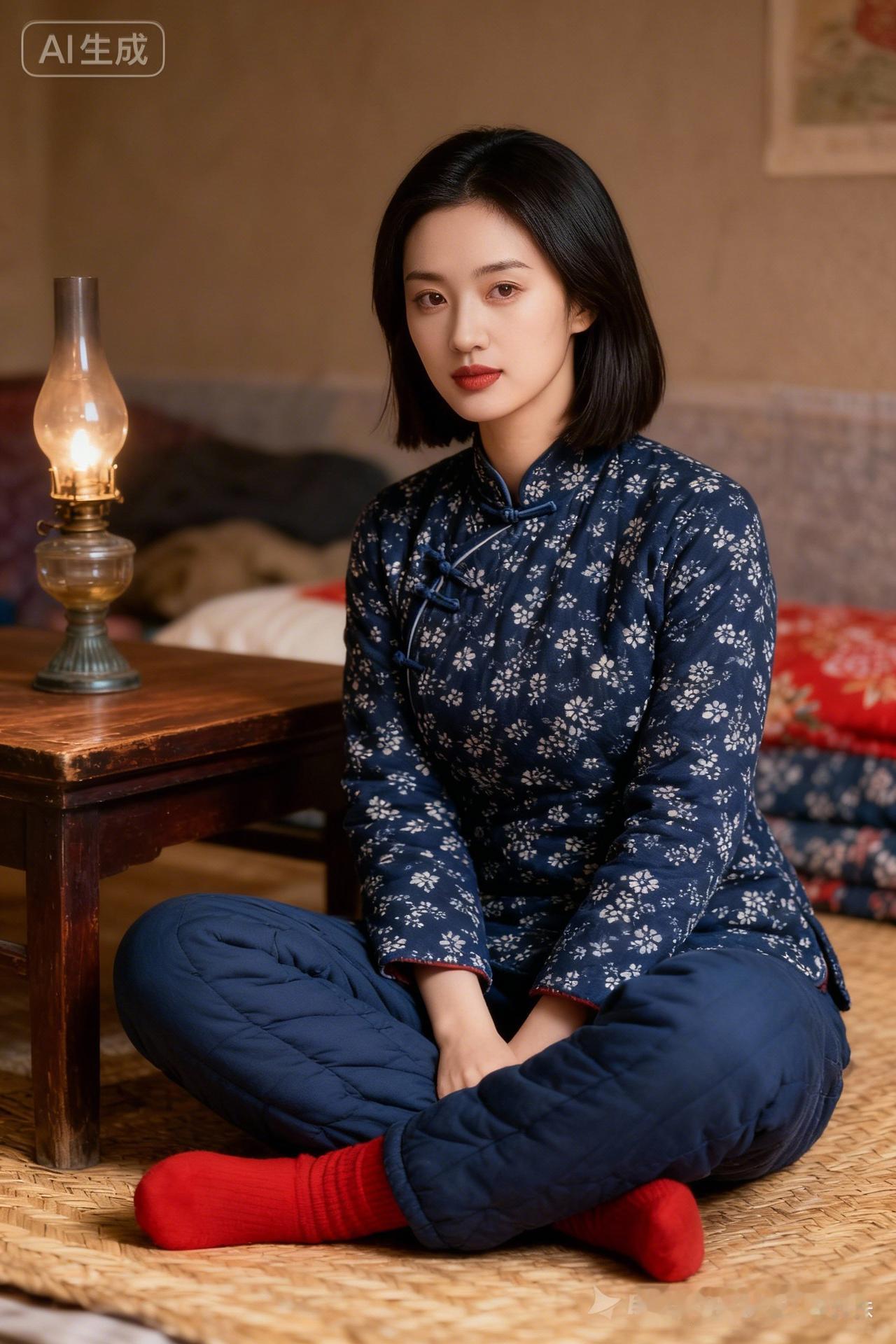 复古风穿搭,蓝色印花睡衣搭配红色袜子,舒适又时尚。