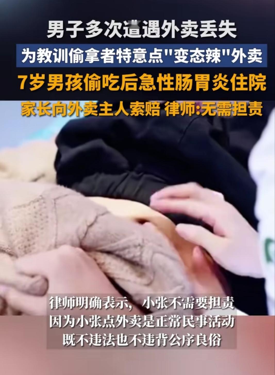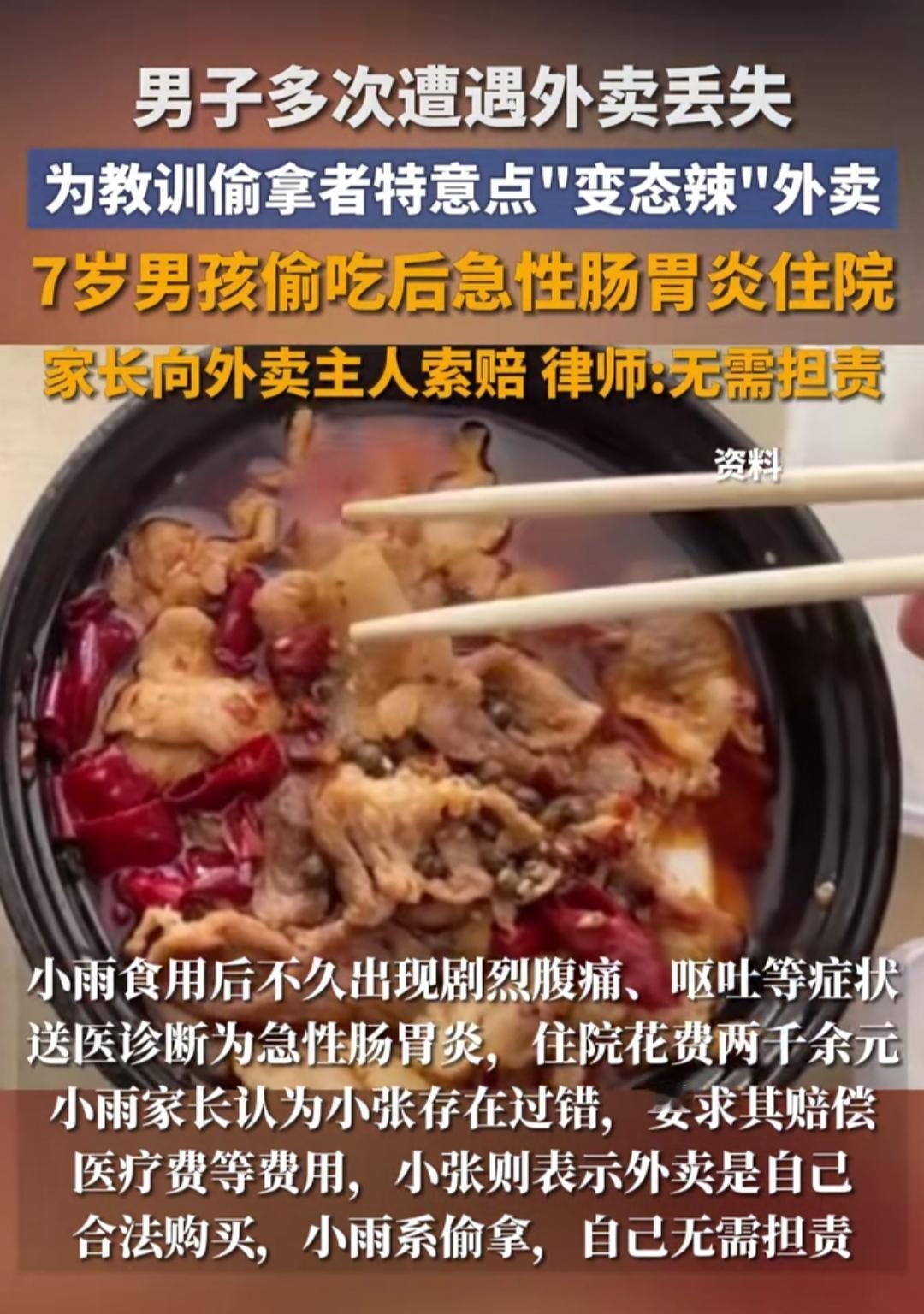 小区门口放份外卖,怎么就闹到孩子住院、邻里反目?7岁男孩小雨在楼下玩时,瞥见邻居小张门口的外卖没上锁,趁没人注意偷偷拆开就吃。可他不知道,这份“变态辣”是小张屡遭外卖失窃后,特意点来防偷的,结果孩子当场辣到呕吐腹痛,连夜送医确诊急性肠胃炎,光治疗费就花了两千多。 小雨家长找到小张索赔,觉得“点这么辣的外卖太危险,就该担责”。但小张满肚子委屈:之前丢了好几次外卖,实在没办法才出此下策,外卖是自己的合法财产,孩子偷拿误食,怎么反而怪到自己头上? 律师一句话点醒众人:小张的防范没违法,“变态辣”是常见口味,没超出合理限度。真正该担责的,是没尽到监护义务的家长。这事也给所有人提了醒:邻里相处要守边界,家长看娃不能松劲,维权也得有分寸,别让小事闹成难收场的纠纷。