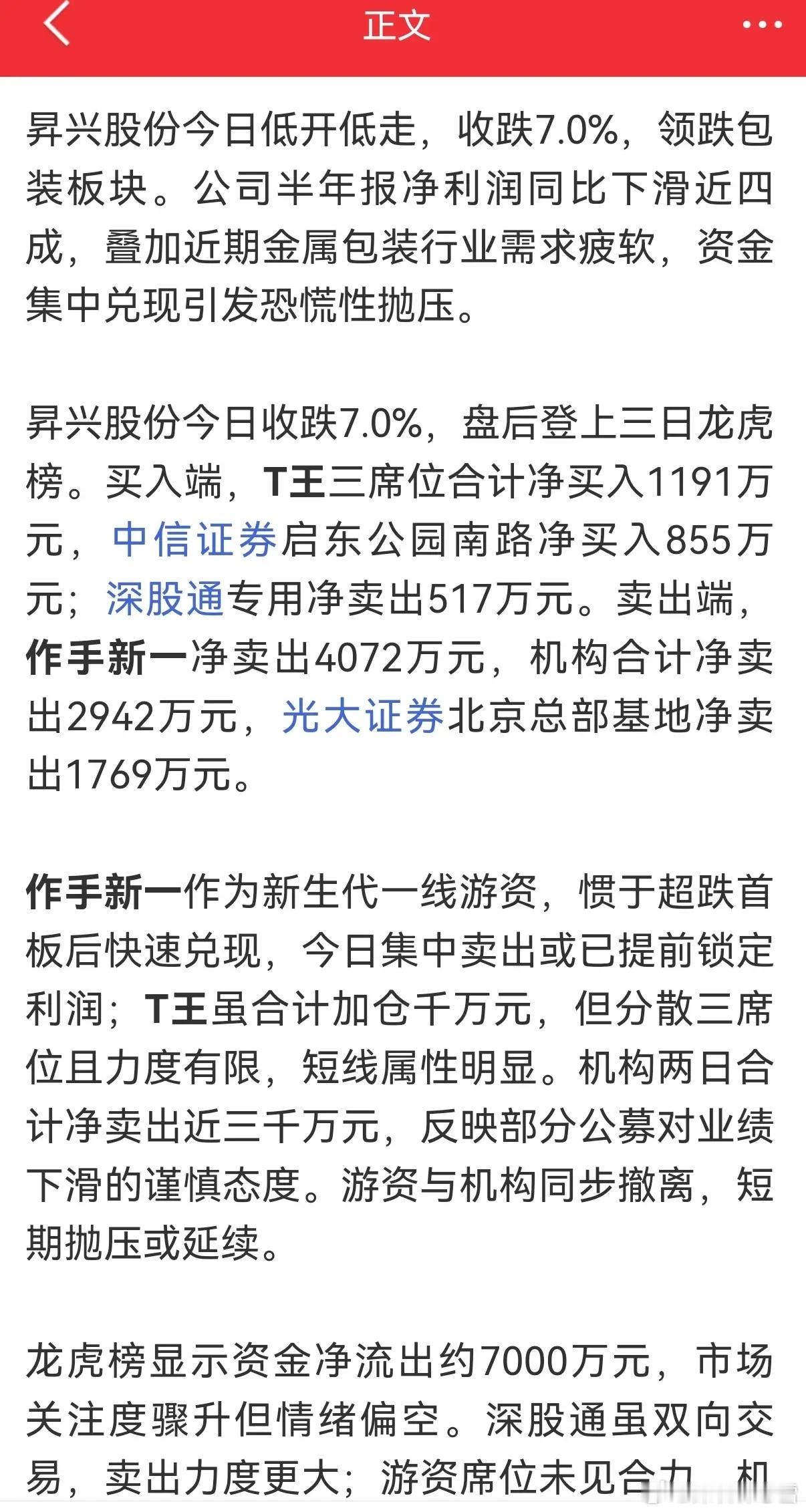 在A股里摸爬滚打久了就会懂:研究跌,往往比研究涨更重要。保住本金从不是我们来股市的终极目标,但没学会赚钱之前,先学会不赔钱,才是立身之本。最近不少朋友问昇兴股份的大跌该怎么看。其实股市里“看不懂”的涨跌本就不少,散户在信息渠道上天然弱势,突发消息难提前获知,只能从走势里找端倪——而走势的强弱转折,往往早有征兆。大家都爱研究连板涨停的强势股,却容易忽略大跌个股里藏的风险信号。就看昇兴股份,此前三连板亮眼,随后高量阴柱开启下跌,反弹阶段没能突破高量阴压力位,反倒是阳线次日大幅破位,典型的双阴出货形态,图中1、2两处的走势,已经是明确的风险提示。两轮下跌后股价回到起涨点,主力自救式拉升看似有戏,可图中3处的放量大阴线,本质还是出货信号,这天离场才是明智之举。次日反包涨停?不过是主力诱多的套路,精准拿捏了做弱转强模式的短线客,随后一字跌停,套牢一批追高资金。再看基本面,刚解除的质押又再次质押,或许就是游资抛售的底层逻辑;再看板块,包装类个股近期集体走弱,除个别例外,合兴包装等标的均难逃调整,板块拖累也让个股难独善其身。这样的标的,我只把它当作风险案例研究,而非机会标的。主力反复做差价却无力创新高,保不齐哪天就被资金彻底抛弃,陷入阴跌泥潭。A股生存法则,从来都是先避坑,再掘金。看懂下跌的逻辑,比抓准上涨的节奏,更能帮我们走得长远。