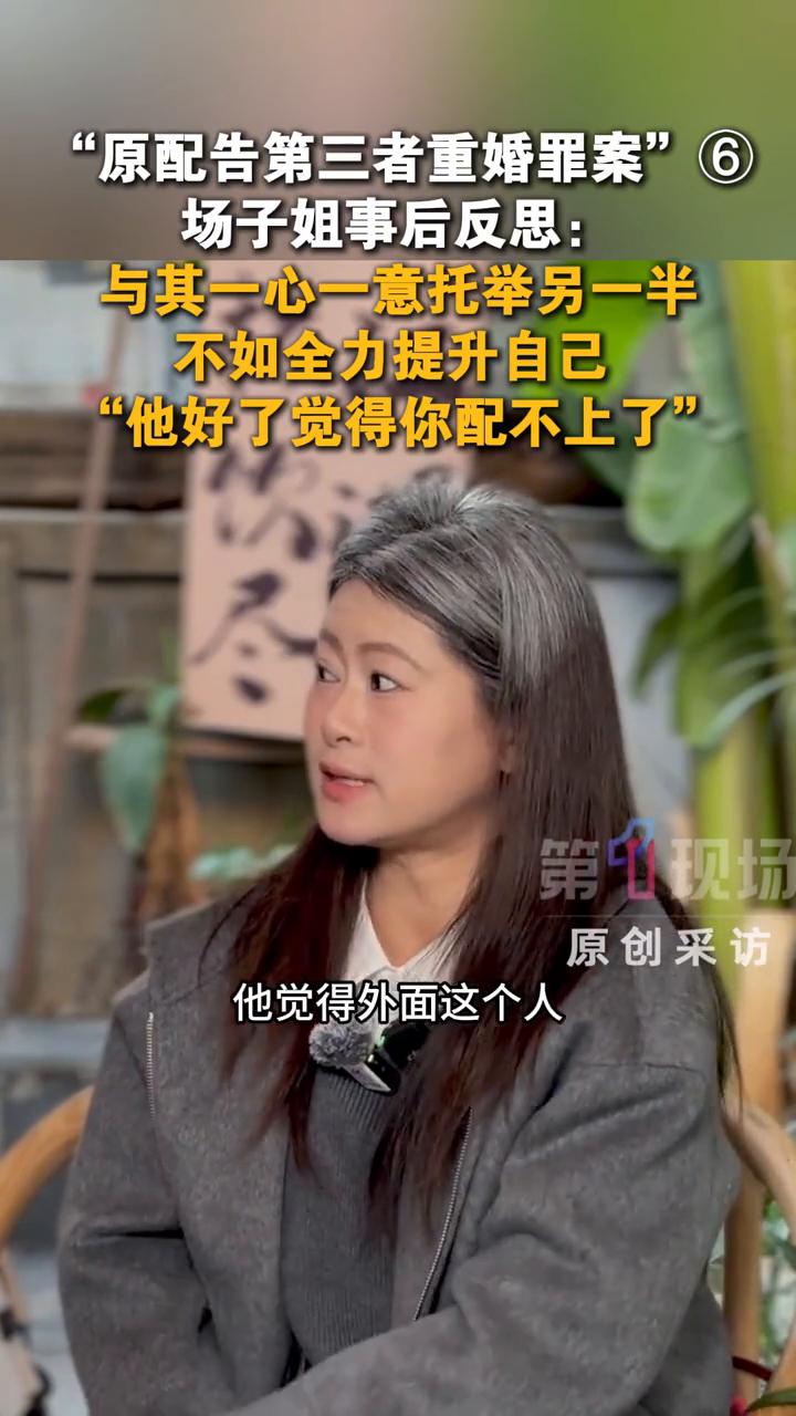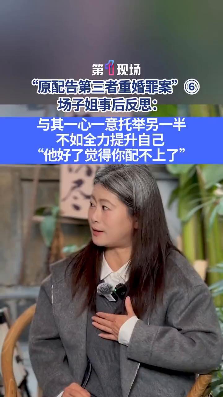 场子姐事后反思:与其一心一意托举另一半,不如全力提升自己。 第1现场:"原配告第三者重婚罪案"原配。 一心一意托举一个男人,觉得男人好了,我就好了。事实并不是,他好了,觉得你有点配不上了,觉得外面这个人可能跟自己更配了。所以我觉得姐妹们一定要托举自己,一定要提升自己的价值。