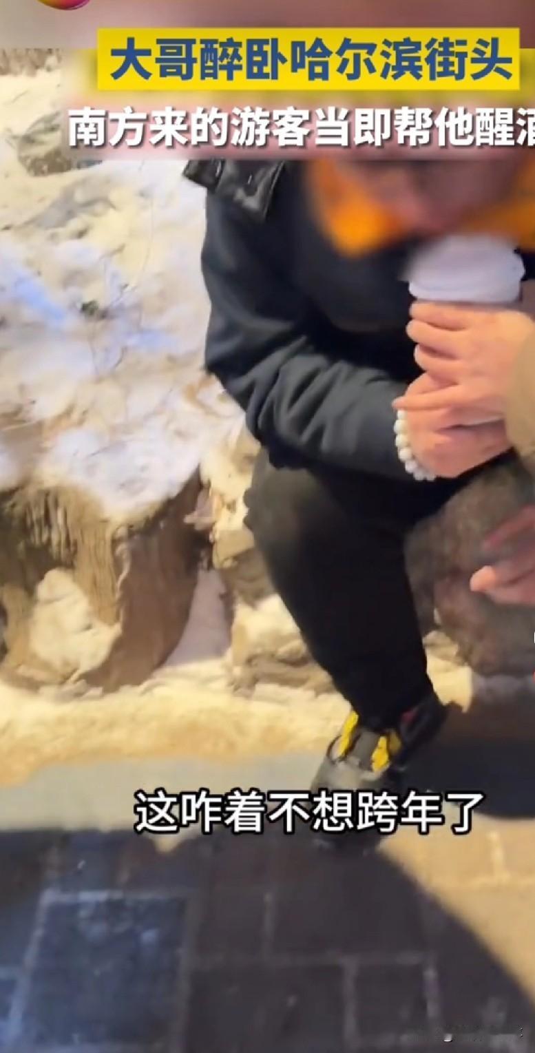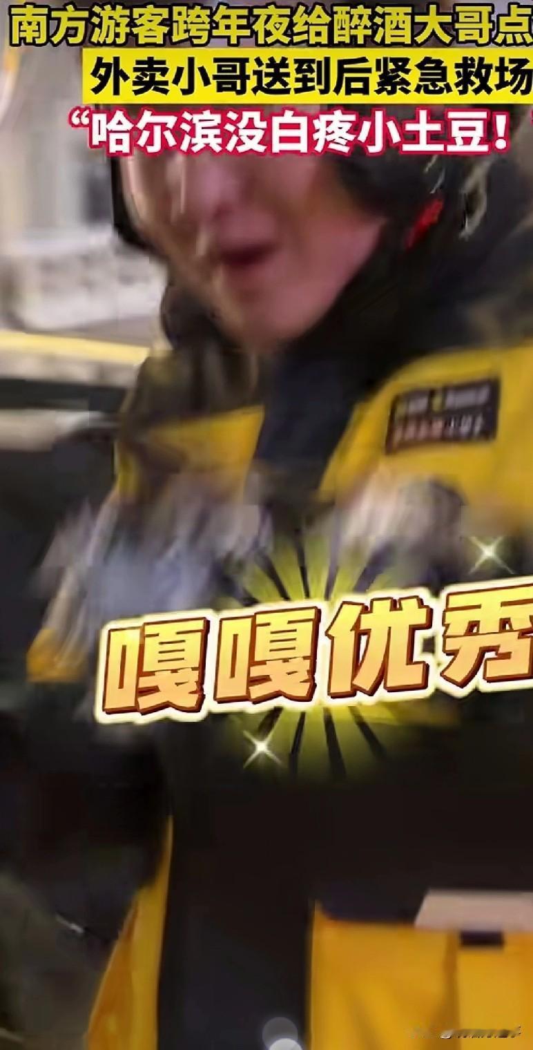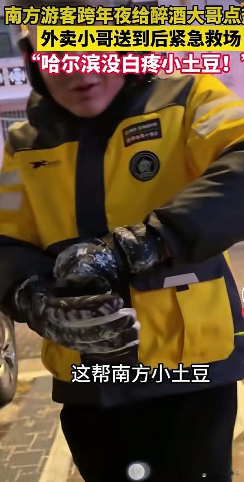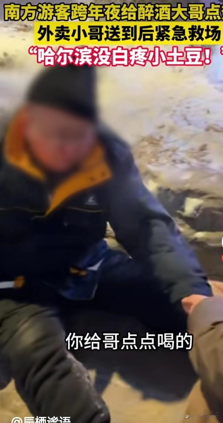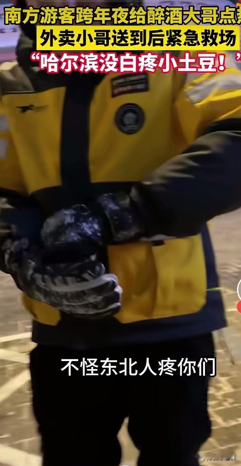 “怪不得东北人疼你们这帮南方小土豆,嘎嘎优秀啊”,近日俩东北大哥被来哈尔滨旅游的南方游客暖心到了。 12月31日,两个特意来到哈尔滨过跨年的南方游客,大晚上看到一个大哥躺在了冰寒的地上,满身的酒气,一看就是喝醉了回不去。两个南方游客顿时不知道怎么办了,在这人生地不熟的地方也不知道应该去哪找谁。 两个人就点了一个外卖,送了一杯热的奶茶寻思给这个大哥暖暖,送外卖的也是个热心肠的人,一眼看出这是俩小金豆,问他们是遇到什么事了吗,地上还坐着个人。 两人告诉外卖小哥,看到有个人躺地上,这么冷的天不叫醒送回去的话,怕他出事,外卖小哥一听立马掏出手机,问来他家里人的联系方式,让家里人快点来接他,走的时候不忘狠狠夸了小土豆们,怪不得这么受东北人喜欢,真是可爱又善良啊。 这话道破了这场南北奔赴的真谛。这个冬天,我们见过太多东北人的掏心掏肺,免费车队接送、进店取暖不消费也欢迎、大街上发暖宝宝,能想到的全给安排上了。 而小土豆们也没让东北人失望,在陌生的城市,看见陌生人有难处,没有扭头走掉,反而想着用一杯热奶茶送温暖,东北人疼小土豆,疼的就是这份不设防的善良。 这个冬天的哈尔滨,冰雪是背景,人心才是最美的风景。而这场双向奔赴的温暖,也让我们相信,无论相隔多远,真诚与善良永远是最好的通行证,南北同心,寒冬亦暖。
