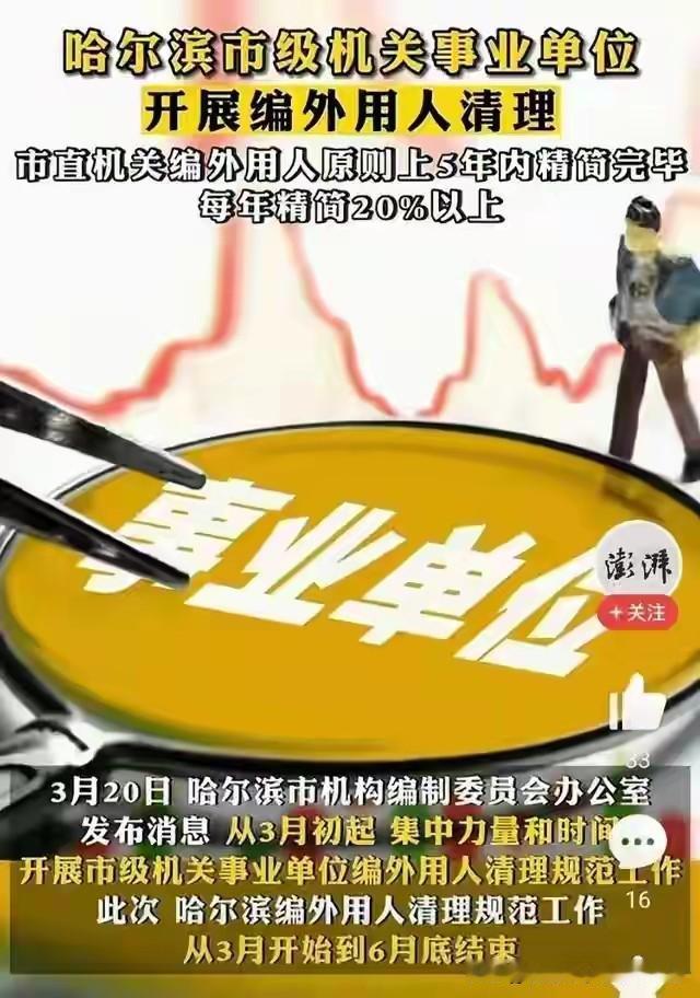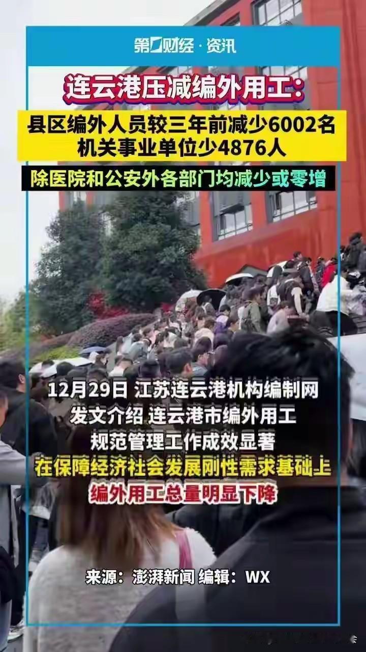 一夜清退6000人!编外人员的“铁饭碗”?2026已经开始了!2025年末,江苏连云港一次性压减县区编外人员6002人,引发广泛关注。这并非孤例,湖北、黑龙江、安徽等多地均已开展类似清理。其背后是三重压力:地方财政吃紧,需直接节流;机构臃肿,亟待提升效能;公众对规范执法、提升服务质量呼声日高。 清退并非“一刀切”,重点针对未经批准聘用、服务窗口使用及超额单位的人员。辅警等关键辅助力量则被保留并规范管理。被清退人员可按《劳动合同法》获得经济补偿。 长远看,此举旨在推动地方政府“瘦身健体”,探索服务外包等新模式,将财政资源更精准用于民生。它标志着公共部门从规模扩张向质量效益的深刻转型,也提醒所有人:适应变化的能力,才是真正的“铁饭碗”。编外岗  编外合同制人员 编外用工 清退编外人 编外用工人员 编外员工待遇 江苏编外招聘 编外专业人才 编外清退 编外人员考试 乡镇编外人员 编外聘任制 广西编外人员 连云港编外减员 江苏编外人员 南通编外人员 事业单位的编外合同制能转正吗